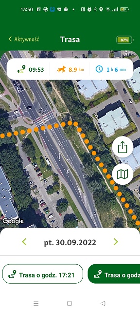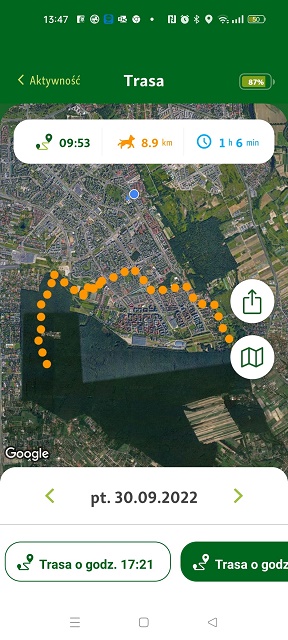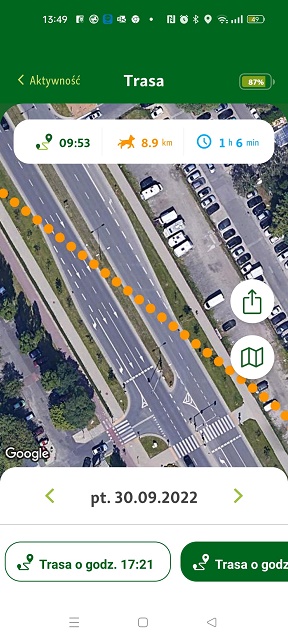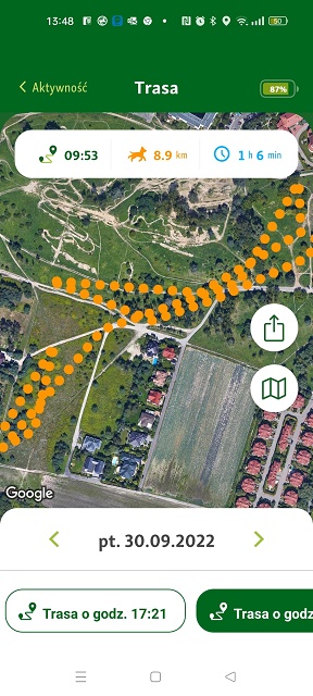 1. Ja do tej pory na myśl o tym trzęsę się cała. Niestety w tej chwili stosuję zasadę ograniczonego zaufania do nich. Chociaż muszę przyznać, że bardzo się pilnują. Luka pierwszego dnia cały czas szła przy mojej nodze. One się ewidentnie zgubiły, ale co ciekawe robiąc tę trasę dobiegały do miejsc, w których chodzimy na spacery. Zawsze dojeżdżamy samochodem, więc nie mam pojęcia skąd wiedziały jak biec. Trasa na GPS wskazuje, że zrobiły wielkie koło i powoli choć okrężną trasą kierowały się do mnie. W każdym razie z powrotem do tego lasu, tylko z drugiej strony. My mamy GPS freesnapf. To niemiecka firma. Jacek kupił je w Niemczech. Są dobre i co dla nas ważne abonament po roku na kolejny rok to tylko 9 euro od sztuki. W Polsce najtaniej jest chyba 20 zł miesięcznie. Odświeżają obraz co 30 sekund, więc jak psiaki biegły, to ja to widziałam. Mogłam przestawiać na lokalizację jednego z nich i na swoją, dzięki czemu na bieżąco widziałam, jak szybko do nich się zbliżam. Jedyne co mi się nie podoba, to licznik odległości. Pomiar jest po linii prostej i ich cala trasa wykazała 8,9 km, ale nie były liczone wszelkie zawijasy, ich kręcenie w niektórych miejscach. Widać to wyraźnie na powiększonym ekranie. To ich cala trasa: Tu widać jedno z miejsc, w których biegały w tę i z powrotem: A to najtrudniejsze dla mnie fragmenty trasy, kiedy przebiegały przez duże ulice: