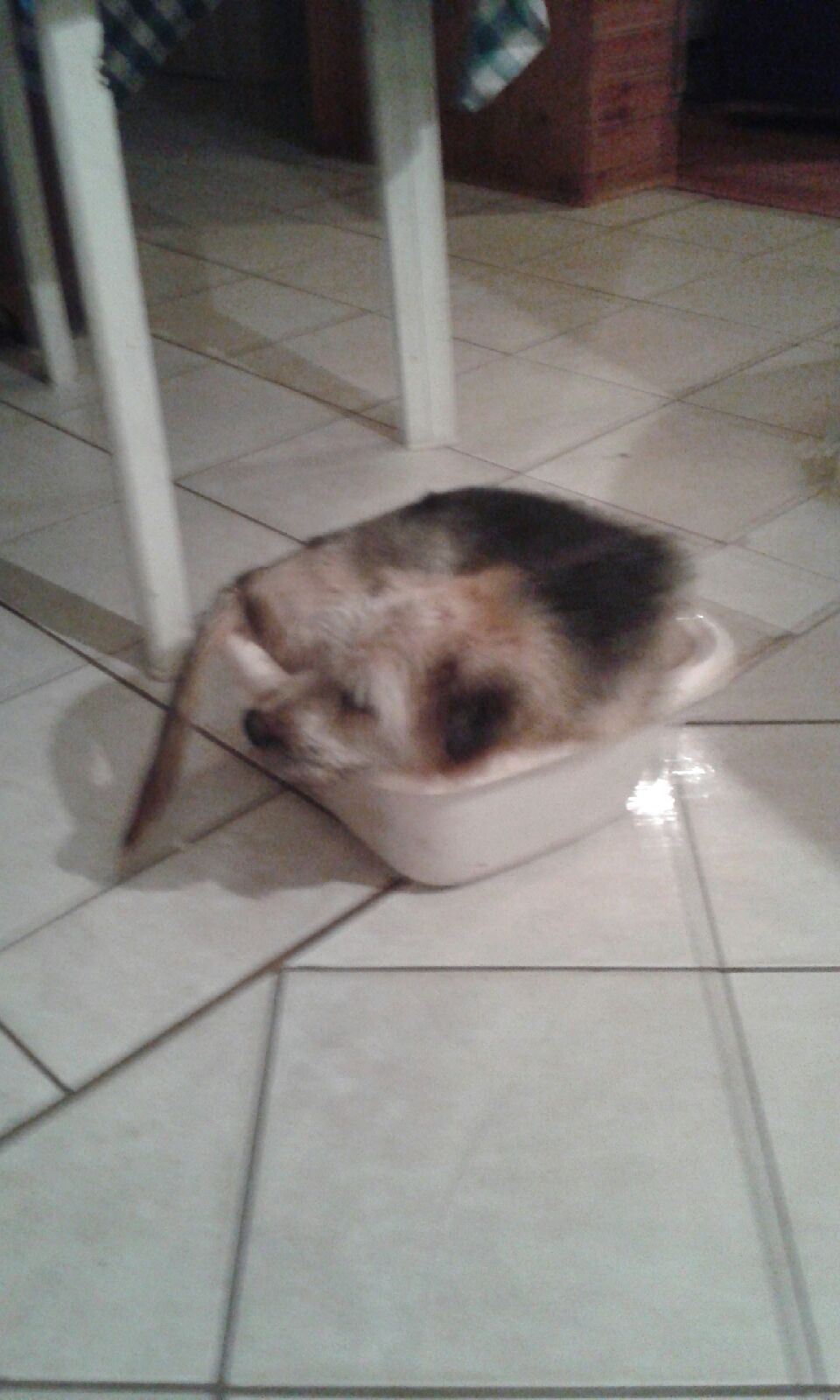 Przedwczoraj zauważyliśmy na portkach Heleny coś białego... Po bliższym przyjrzeniu się konsylium orzekło jednogłośnie - człon tasiemca, blllleeeeeeeeeeee!!!! Ruszał się, blllleeeeeeeeeee!!!! Takie są skutki lumpowania i myszożarcia, blllleeeeee! Wczoraj zatem odbyliśmy podróż do Doktora w składzie: Helena, Gapcia na oczyszczenie gruczołów, bo zaczęła saneczkować, Kreśka na szczepienie na wściekłość i Lesio na obejrzenie cushingowe. Imka, Lili i Kocio zostali pilnować chałupy ;) Matko moja, co to był za wesoły autobus! Helena się darła całą drogę, jakby ją ze skóry obdzierali, Kreska w samochodzie jest nieznośna, bo się miota i cały czas piszczy, a Gapcia jest sztywna jak Pal Azji, dyszy i ślina jej cieknie hektolitrami. Do tego wszystkiego radio, które miało zagłuszać kota i Kreskę! :D Tylko Lesław znosił wszystko z godnością :) W lecznicy - cud od boga - nie było kolejki, bo w poczekalni wcale nie było lepiej - koncert duetu Helena/Kreska, Kreski próby bycia wszędzie na raz i Gapciowy paraliż...Przepuściliśmy tylko małego szczeniaczka, który przybył się zaczipować, a potem zrobiliśmy mega zator, bo gdy wreszcie wyszliśmy z gabinetu po wszystkich badaniach, zabiegach, zastrzykach oraz po uzyskaniu odpowiedzi na spisane na kartce pytania różnej treści, w poczekalni kłębił się tłum pacjentów, choć była już godzina zamknięcia lecznicy :( Pobraliśmy 21 tabletek na odrobaczanie dla psów, dwie dla Kocia, a Helka za karę dostała zastrzyk. Mieliśmy nosa, że dzień wcześniej nabyliśmy drogą kupna pętko pasztetowej :D I wstawiam też zaległe obiecane zdjęcie Lesia z czasu remontu, gdy biedny, z rozpaczy, że nie może się doczekać normalności, ułożył się do spania w misce ze szmatami! Aha, zważyłam Kreskę po "diecie śliwkowej" i biegusiem zaczynamy się odchudzać!!!!!!
