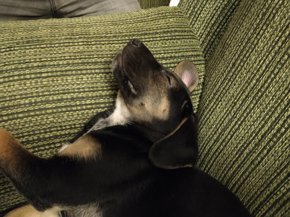 Aurunia jest wspaniale wychowana. Ogonek bez przerwy merda, ani przez moment nie był skulony pod brzuszkiem, bo mała w ogóle się nas nie boi! Bawi się na całego, a potem przysypia. Warunek jest jeden: nie może być sama. Raz obudziła się, gdy nikogo przy niej nie było i podniosła taki lament, jakby coś strasznego jej stało. A byłam w tym samym pokoju, tyle, że Aura mnie nie widziała. Zwiedziła już cały dom. Ładnie bawiła się w ogródku, w liściach, choć jej towarzysz podróży, Oreo nie dał się zaprosić do harców. Zobaczymy, jak minie nam pierwsza noc.