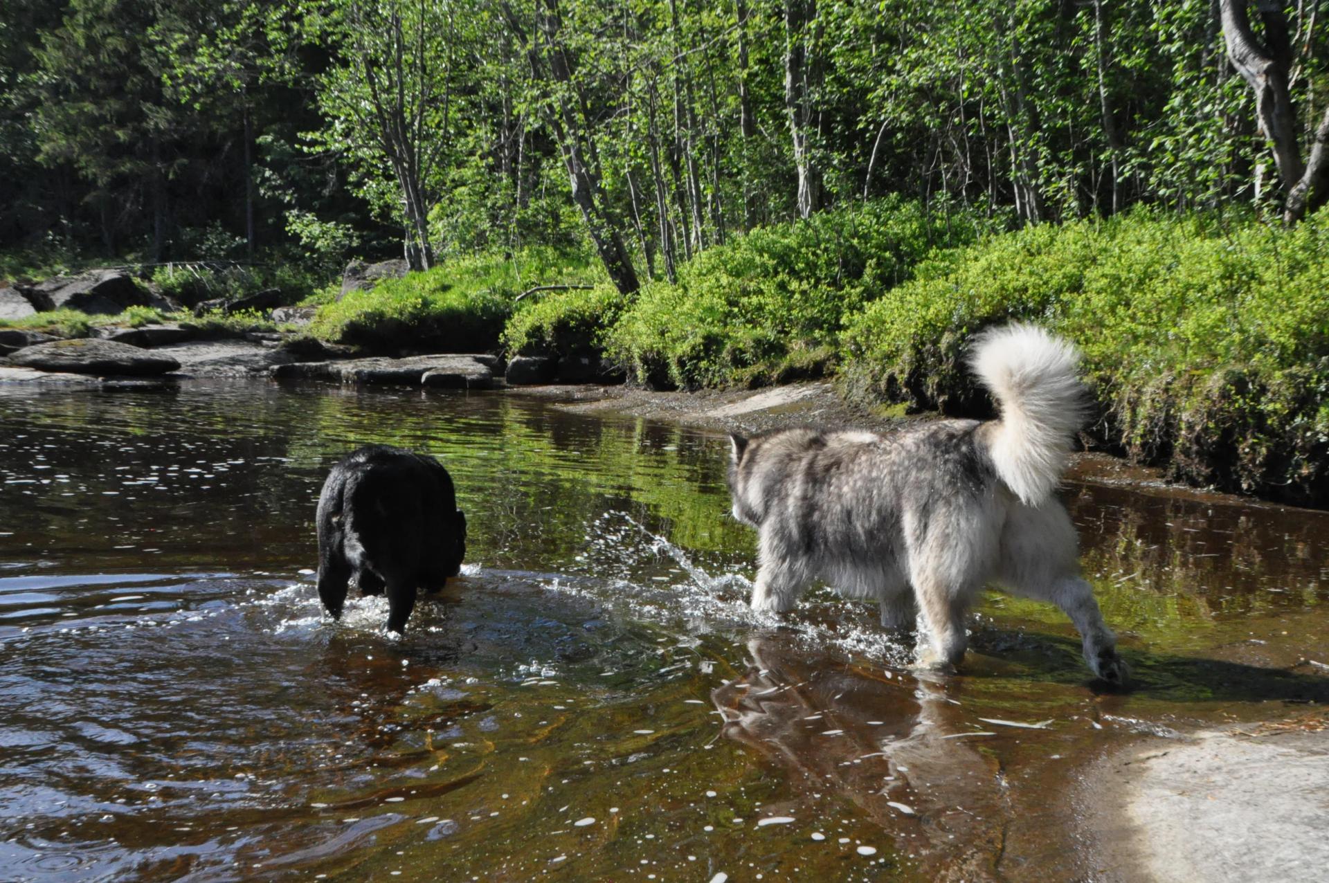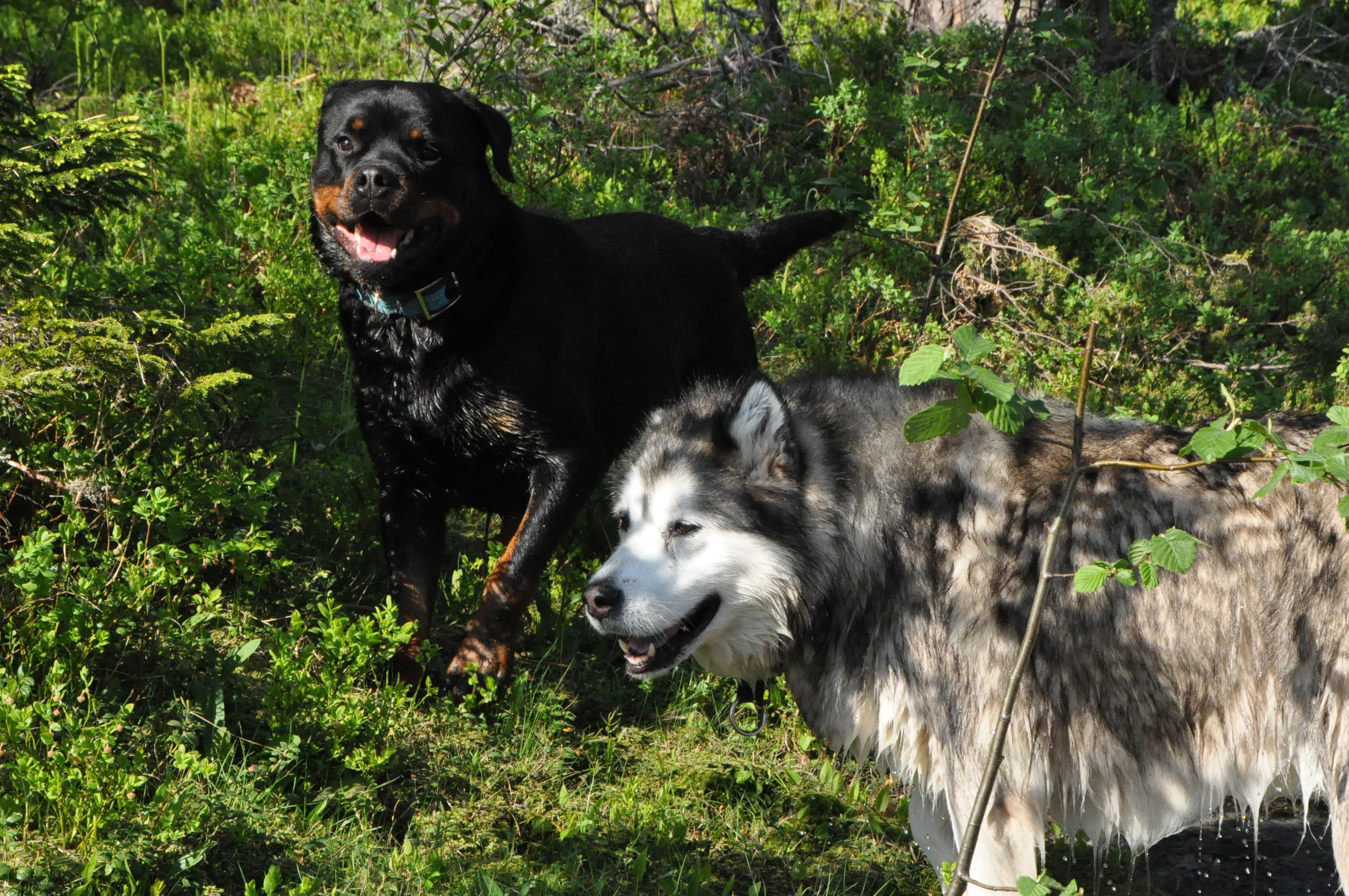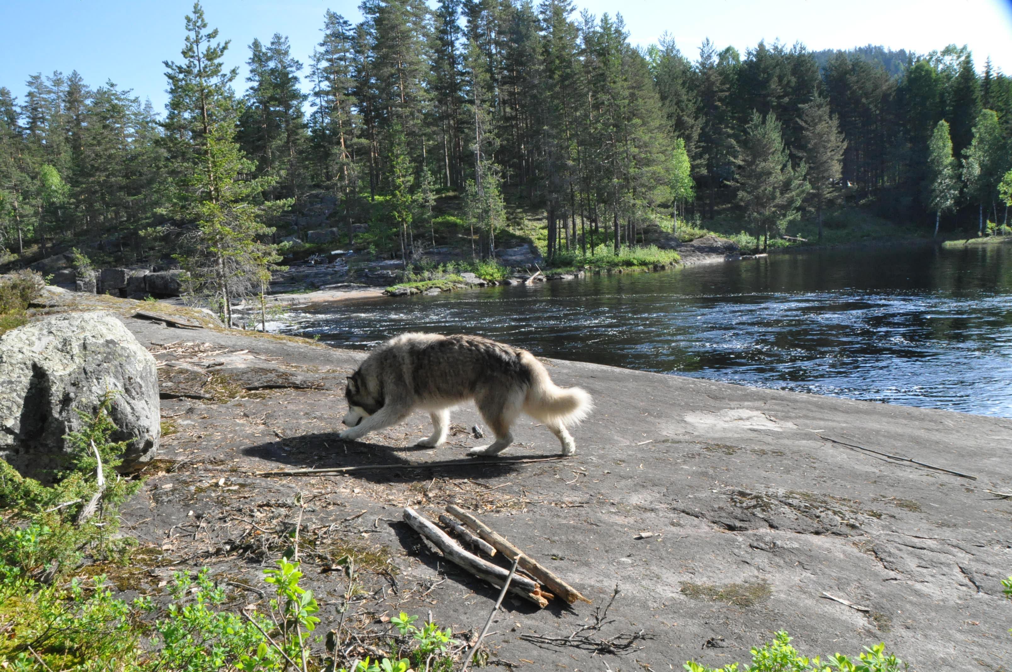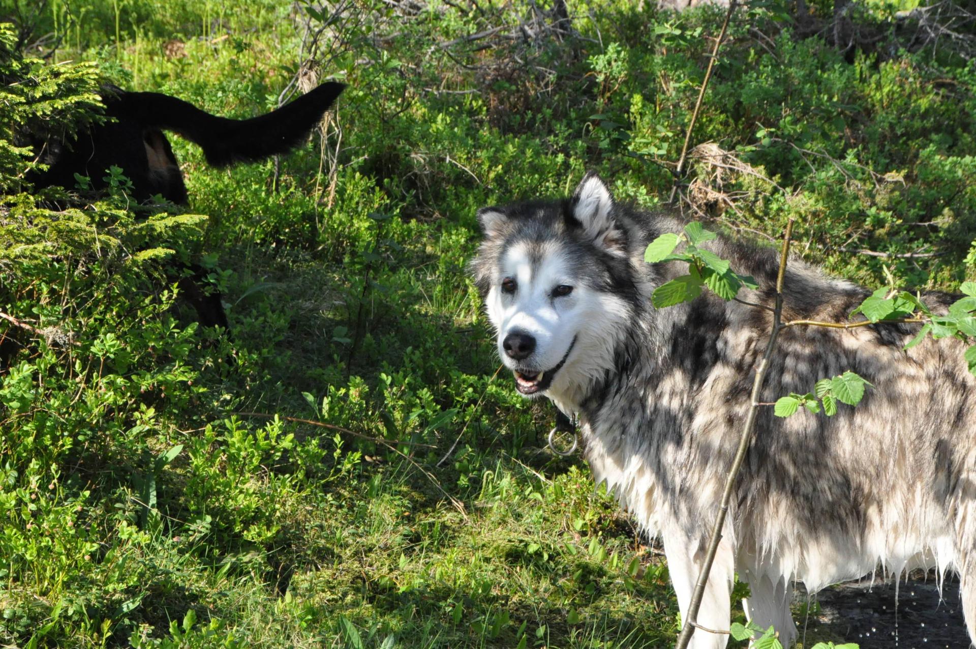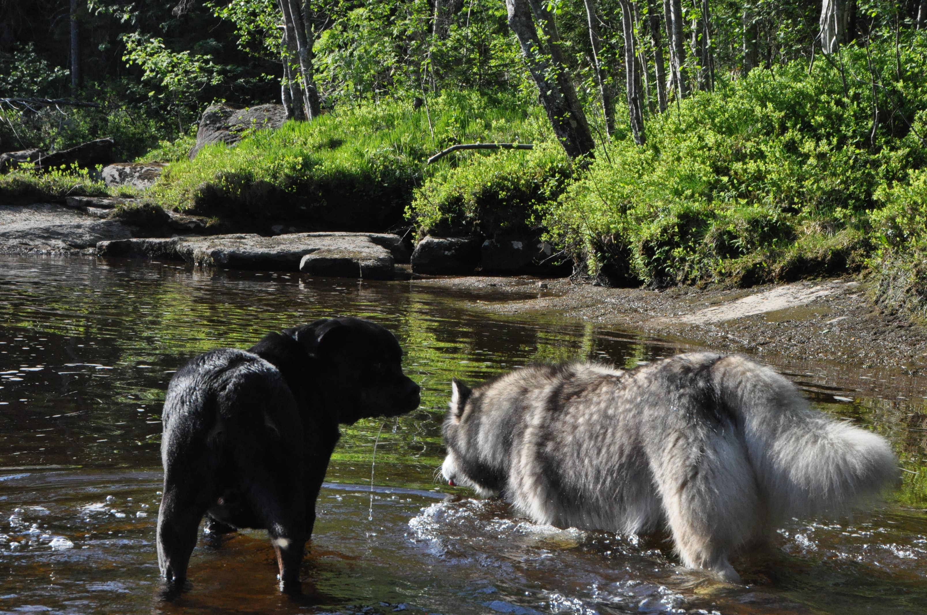 a my w miedzy czasie trochę łazikujemy. Mamy tu spore upały 25-28 stopni w cieniu, wiec grubo ponad 30 w słońcu..grama wiatru i zero chmur... trawę sobie w ogródku i w kolo domu wykosiłam a ona zamiast sie zagęszczać to żółknie i usycha... w lasach duże zagrożenie pożarowe... a w najbliższych dwóch tygodniach nie zapowiada się na jakikolwiek deszcz, także roślinność ma przechlapane.. najpierw dłuugaśna zima teraz suche lato.... Oczywiście Maszy nie katuję spacerami bo by się dziewczyna zamęczyła z tym futrem.... rano zraszam porządnie trawę zaraz przy domu, tam gdzie Maszka ma ulubioną miejscówkę do leżenia i potem ona sobie w tym chłodnym, wilgotnym cieniu leży i drzemie. Hirka czasem idę trochę zmeczyć spacerem po lesie koniecznie z moczeniem doopki w jeziorze czy rzece... No i ciesze się, bo jagodziny owocować będą, już sporo owcoków jest na krzaczkach :) -