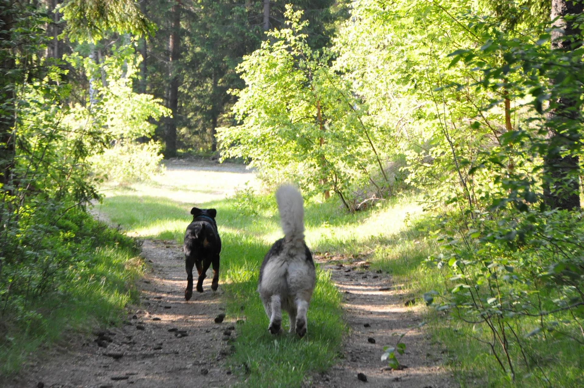 No teraz mam dość mocne zboczenie na punkcie obróżek dla psów ale tylko dla Quincy bym kupowała.. Hirek ma i jakoś pod niego nie mam weny na kupowanie a Masza ma swoją od x lat z Manmat-a i raczej już przy tej zostanie do końca. Jak na ironię wiem dobrze, że z upływem czasu obroży na Quincy nie będzie widać bo będzie miała długie kłaki na karku i obfitą kryzę, więc obroża zniknie w tym futrze... ale póki będzie mieć puch szczenięcy i półdługie kłaki podrostka to mogę z obrożami wydziwiać :) Na Hiro najefektowniej wygląda ten łańcuszek co ma... przynajmniej mnie się najbardziej podoba :) Ale teraz jak mu karczycho schudło po zimie to ten łańcuszek by trochę wisiał no i zawsze jest ryzyko że mu się zsunie z karku jak węszy i buszuje po zaroślach i krzaczorach, dlatego ubieram mu tę obrożę bo wiem, że nie zgubi. No i kolorystycznie pasuje do flexi bo flexi też taka jasnoniebieska. Jeśli chodzi o spontaniczne zakupy to ja niezbyt często mam okazję na takowe.. Bo jednak człowiek przyjechał tu się czegoś dorobić wiec stara się nie być rozrzutnym.... po drugie mieszkam na takim zadupiu, że do najbliższego sklepu zoologicznego mam 80 km, w Drammen.. i jestem tam raz na ruski rok. Jeśli zaś chodzi o szczęśliwość psów ze swobody, którą mają to fakt staram się je zapinać na smycz tylko w razie mocnej potrzeby typu droga czy ludzie. Ludzi od tygodni, ba nawet miesięcy nie spotkaliśmy żadnych więc są na smyczy tylko ten kawałek, który idziemy szosą do lasu w którym jest płasko, bo za domem mamy spore zbocze ale tam jest zawsze pod górkę i to dosyć ostro i nie chce mi się tam psów taszczyć. -