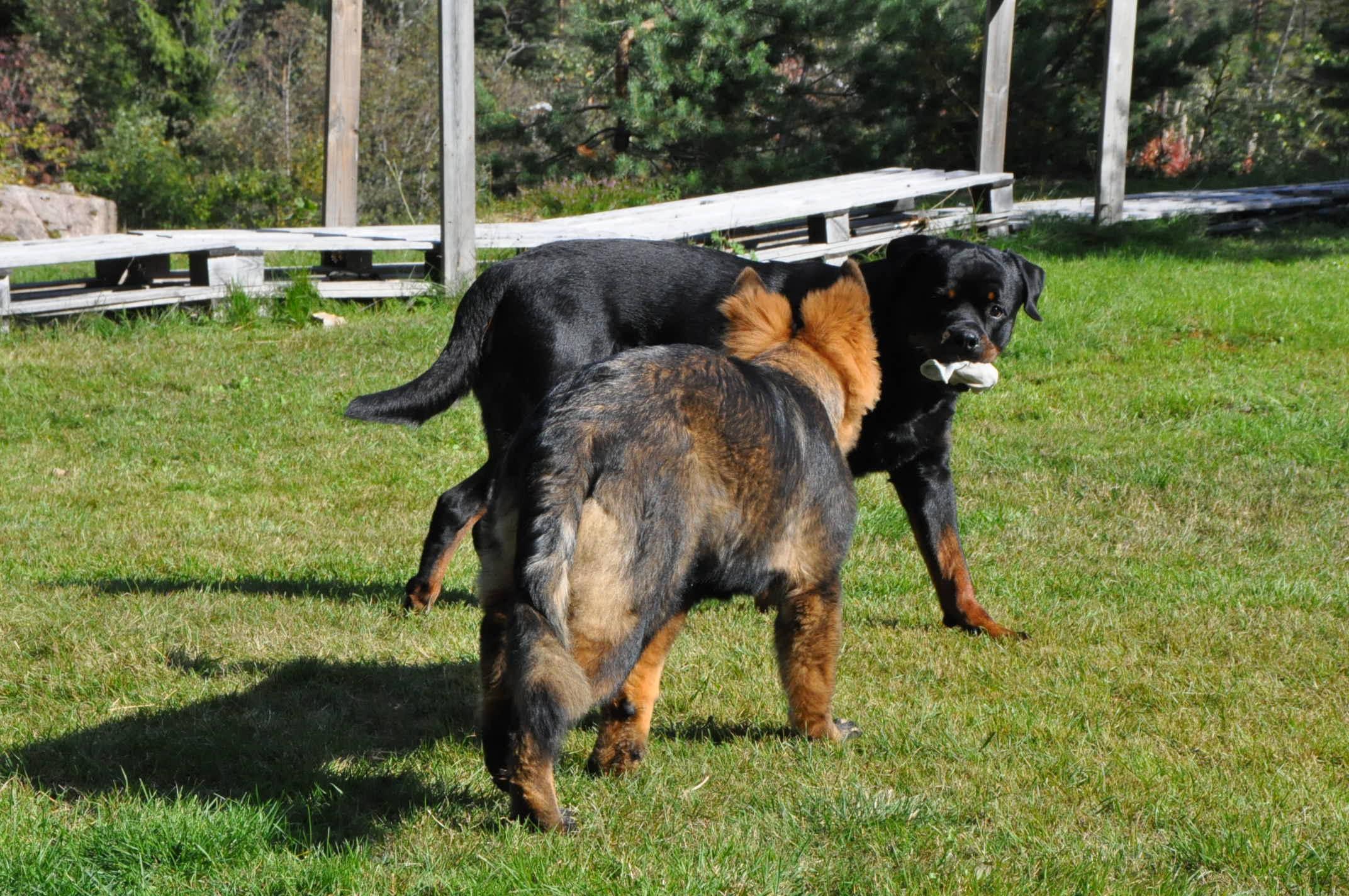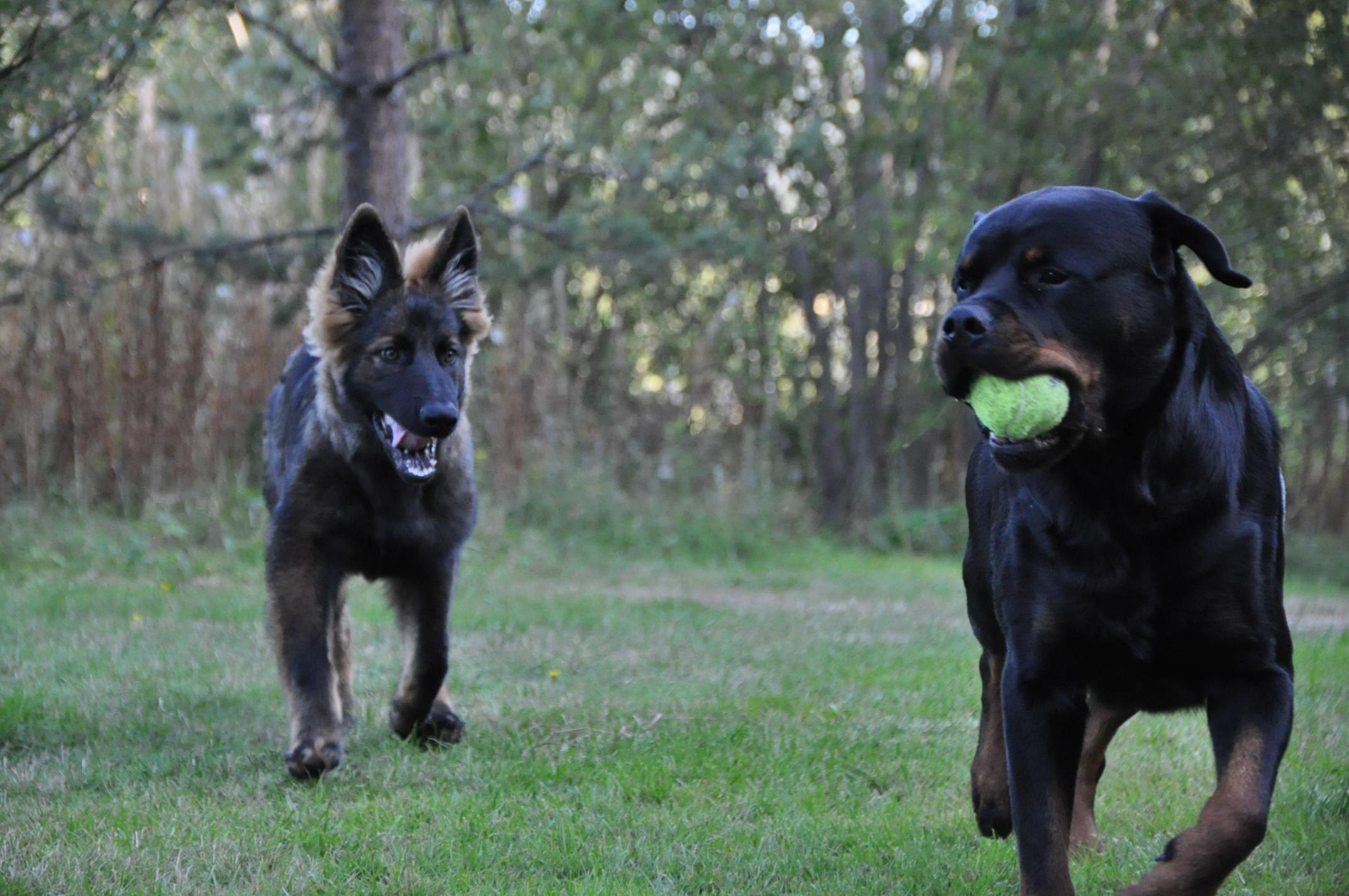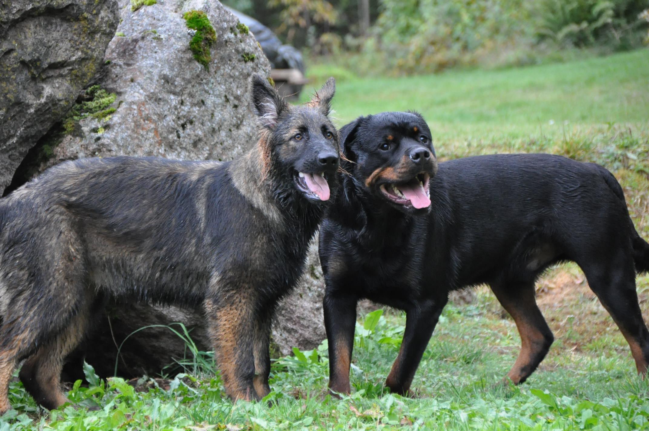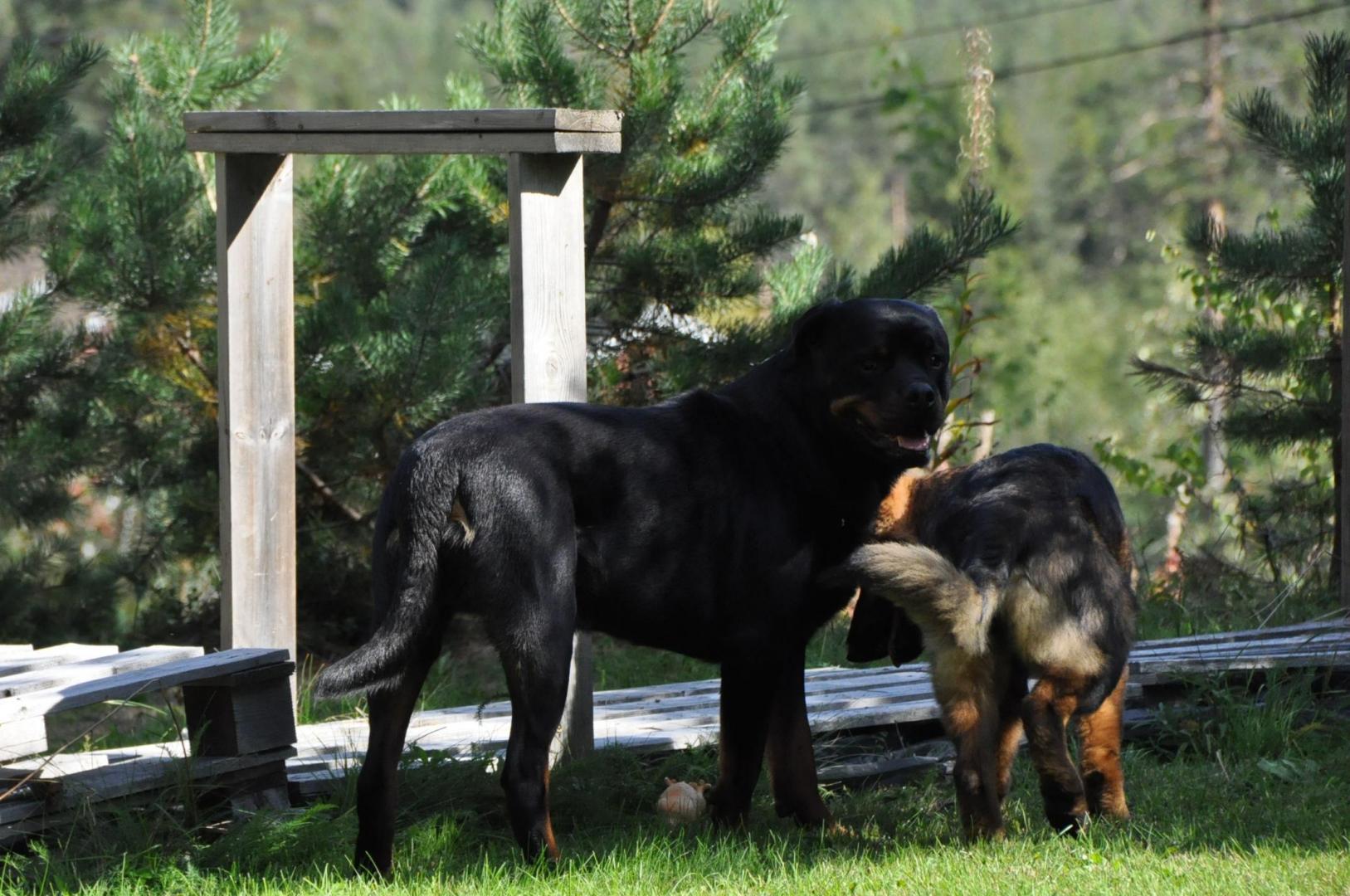 No właśnie ja też jestem trochę w szoku bo obydwa psy to psy ras średnich i rott i owczarek.... tyle, że Hiro jest wzrostowo średniakiem a Quincy jako Staroniemka jest po prostu większa od klasycznych owczarków. Nawet ostatnio koleżanka z FB mi pisała, że jak jeździ na wystawy(z siostrą Quincy ) i owczarkarze widzą 5-cio miesięczne szczenię staroniemieckie to są w szoku jeśli idzie o wielkość, bo różnica jest podobno kolosalna... No na zdjęciu obydwa psy nie stoją jakoś super nierówno i koślawo, stoją na tym samym poziomie. Hiro robi krok ale na drugiej łapie stoi prosto więc nie jest zaburzona jego sylwetka. Zdjęcie jest surowe bez żadnego obrabiania. Jak się razem bawią to Quincy wydaje się ciut niższa ale ona to ciało zupełnie inaczej układa w ruchu niż Hiro... Ona ma krok bardziej posuwisty, bardziej płynie niż biegnie. -
