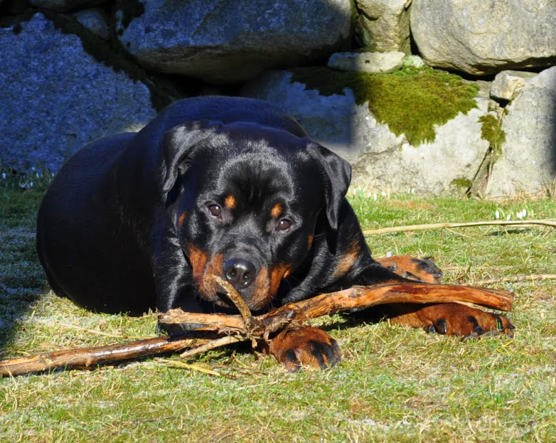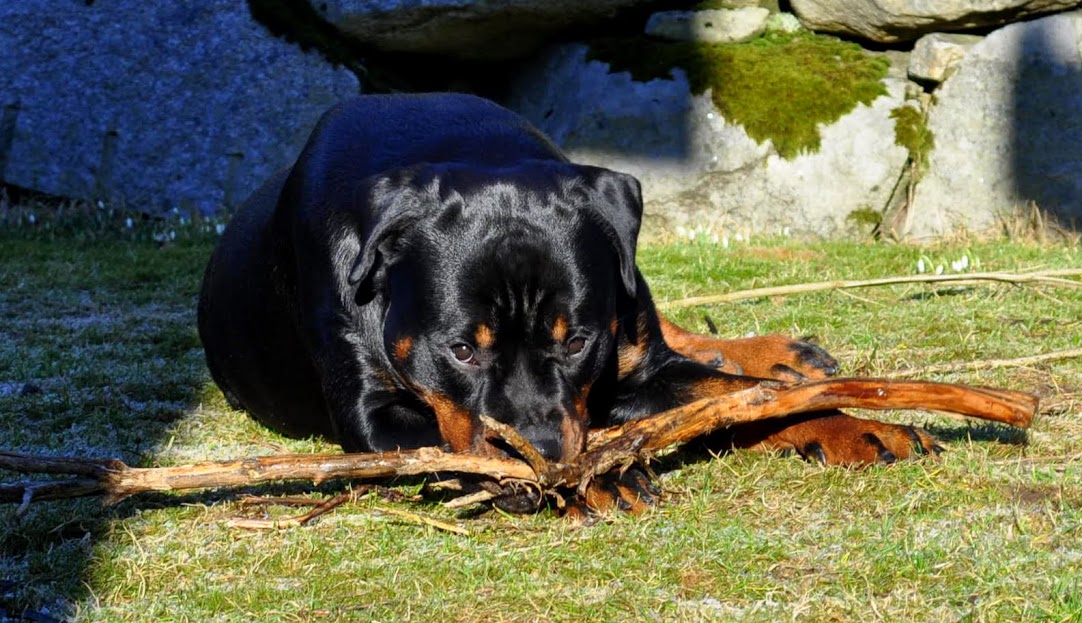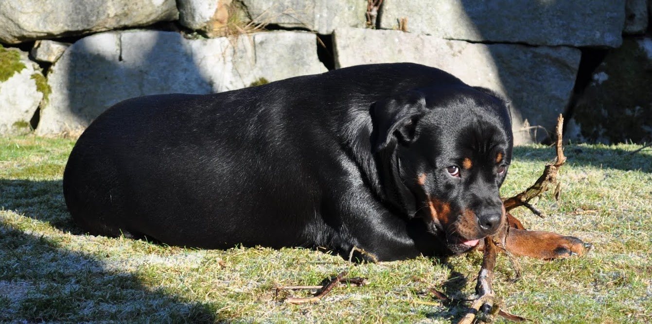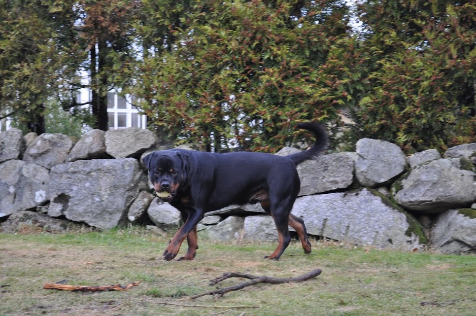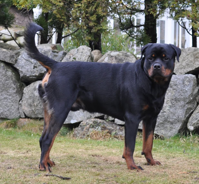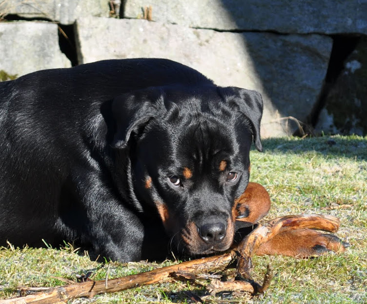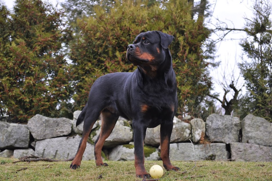 heh... dzięki :) On ma teraz 15 miesięcy, więc nadal jest w fazie rozwoju. Wiadomo nie jest to już tak dynamiczny rozwój jak pół roku temu ale jeszcze się zmienia i rozrasta. Rottki ostateczną sylwetkę osiągają w wieku ok 3 lat. kości długie rosną do ok 18 miesiąca.... najintensywniej rosną do roku, potem to już minimalne różnice ale coś tam jeszcze się wyciąga. Staramy się go nie przekarmiać, żeby i tak chorych stawów nie obciążać. Jak ma obrastać to niech obrasta mięśniami, nie tłuszczem. Wygląda myślę optymalnie. Nie ma przesady w żadną stronę. -