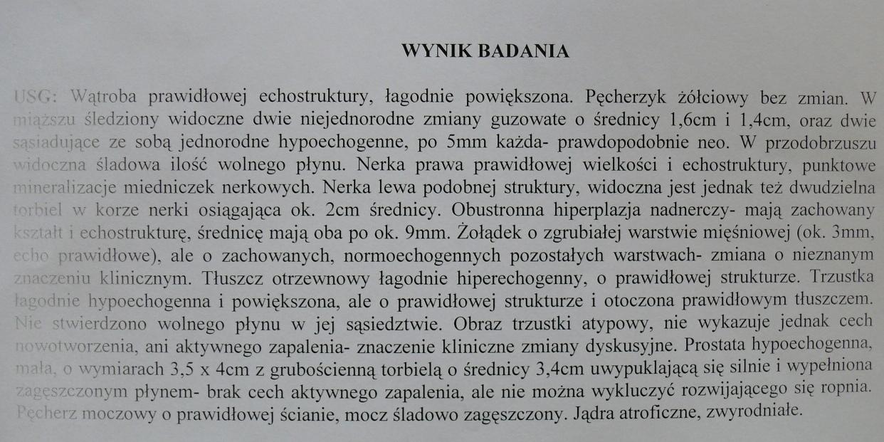 Wynik krwi wskazuje na stan zapalny. Bad. kału na strawność wykazało, ze jedzenie jest trawione. Wynik USG bardzo nieciekawy: prawdopodobnie trzeba wyciąć śledzionę i jądra plus prostatę (ja myślałam, że on jest kastrowany, a on ma takie jąderka w zaniku). Trzustka brzydka, ale raczej nie nowotworowa.