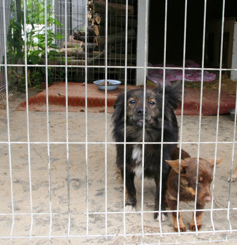 A teraz zapowiedziane wcześniej dzikuski od zbieracza. Jedna piękniocha- szczerbata suczka i 2 facetów . Sunia nie ma oczka a wiek to ok 6-7 lat , jeden pies ten kudłaty to jest młody ok 2 letni a czarny nie wiem...raczej starszy. Na chwilę obecną wszystkie warczą i szczekają . Nie dają się dotykać i tu jest problem, bo chciałam środek na kleszcze im zastosować, to na psikacz reagują atakiem a na olejek nie ma szans a kleszczy na nich mnóstwo. Codziennie z 30 zabijam na ziemi u nich w boksie.