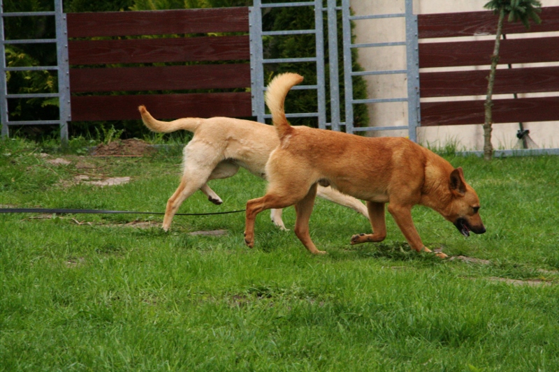 To Sekret na spacerze. Teraz już chodzi dobrze na smyczy, ale zaczynał od szelek i róznie to bywało. Jest przyjacielski do wszystkich...psiaków też.Młody (10miesięcy), po wszystkich zabiegach . Taki grzeczny, pozytywny psiak i przepraszający za wszystko. Uroczy, ale jeszcze nie nabrał pewności siebie na tyle by się całkowicie wyzbyć strachu. Także, trzeba być jeszcze ostrożnym i delikatnym w kontakcie z Sekretem. Na zdjęciach też Hanusia i Sajmon.