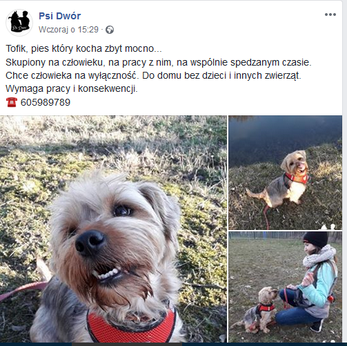 Tofi nie ma pieniędzy na bieżące płatności.Myślałyśmy,że pies pójdzie z hoteliku wprost do domu stałego. Nie ja sama decyduję o Tofiku. Ma zarezerwowany termin w hoteliku Pet House w J Górze od połowy kwietnia za 600 zł z karmą. Tofika p. Kasia dłużej nie zatrzyma. Pozostaje schron, albo eutanazja? Niżej ostatnie wpisy na str Psi Dwór. O tym ,że Tofik atakuje inne psy wiemy dopiero kilka dni , rozmowy z dt trwały wcześniej.