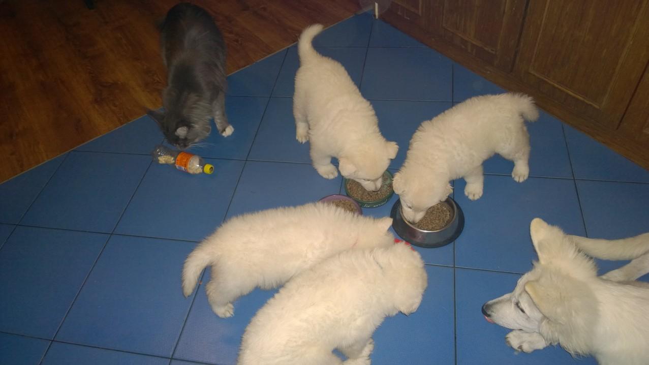 możesz kupić dobrą karmę - w tym wieku ja wolę dać szczeniakowi DOBRĄ zbilansowaną karmę szukaj karm OD 4 TYGODNIA ŻYCIA i musi być to starter - polecam BRIT CARE -> http://www.telekarma.pl/p20641-brit.care.grain.free.puppy.salmon.amp.potato.html?gclid=CISr5fmI1c4CFaPFcgodb64PUw karma od 4 tygodnia życia - dlaczego? bo jest za mały na inne możne być też ta -> http://www.zooplus.pl/shop/psy/karma_dla_psa_sucha/josera/family/494984 oraz ta karma -> http://www.zooplus.pl/shop/psy/karma_dla_psa_sucha/greenwoods_sucha_pies/greenwoods_junior/453483 i ta - > http://zooserwis.pl/arion-original-puppy-large-chicken-rice-12kg.html?gclid=CMzXrI2K1c4CFQvncgodNecJ7Q na bazie łososia jest nawet lepsza - > http://zooserwis.pl/arion-original-puppy-large-salmon-rice-12kg.html i ta -> http://www.zooplus.pl/shop/psy/karma_dla_psa_sucha/belcando/belcando_puppy_junior/483248 to są dobre karmy dla takiego szczeniaka w przystępnych cenach, nie kupuj marketingówek czyli takie jakie mają w w markecie czy sklepie
