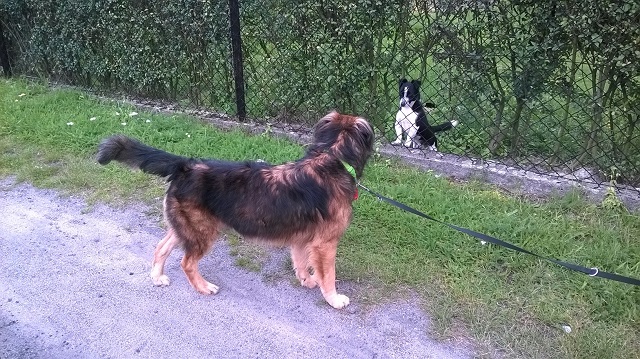 Zapoznanie wypadło dobrze,choć Kama jest bardzo zazdrosna o Pana Piotra i nie zbyt była zadowolona gdy witał się z Ronim.Roni natomiast bardzo przyjaźnie nastawiony tak jak do wszystkich psiaków napotkanych na spacerach.Poradziłam aby wybrali się na wspólny spacer bo na większej przestrzeni psiaki zachowują się zupełnie inaczej....