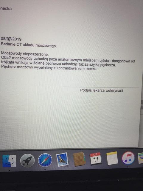 Rozmawiałam z p.Wiolettą i w czwartek Państwo byli z Atilką w Warszawie na USG i Tomografie.Pani doktor na USG już zauważyła jakieś nieprawidłowości,które potwierdził tomograf.Zaraz po naszej rozmowie przyszedł mail wyniku i p.Wioletta zaraz mi go przesłała Jak z niego wynika Atilka ma wadę wrodzoną i wymaga operacyjnej korekty,tak aby moczowód/moczowody były połączone z pęcherzem i mocz spływał do niego,a nie po za. Będzie ustalany termin operacji w klinice w Warszawie i jak tylko będzie znany,to p.Wioletta da mi znać. Otrzymałam kilka zdjęć Atilki i filmik :)