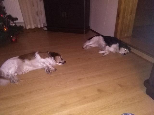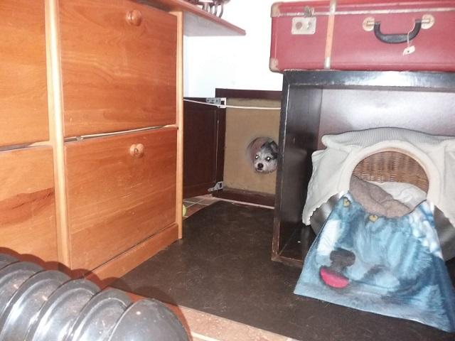Wiadomości z domku Duni :) Świątecznie pozdrawiam i Ciebie i Twoja Siostrę Udało mi się zrobić zdjęcie Duni prawie w domu czyli,jak do niego wchodzi. Ma ocieplone wejście i domeczek w głębokiej szafce. A że nie spieszno jej do spania że mną, wstawiłam jej grzejnik olejowy. Kochamy się bardzo, wciąż bezdotykowo. Obserwuje rytuały domowe i coraz mniej panikuj. Ładnie je mokre z "Doliny Noteci" Jest ruchliwa i wesoła. W załączeniu dzisiejsza fotka