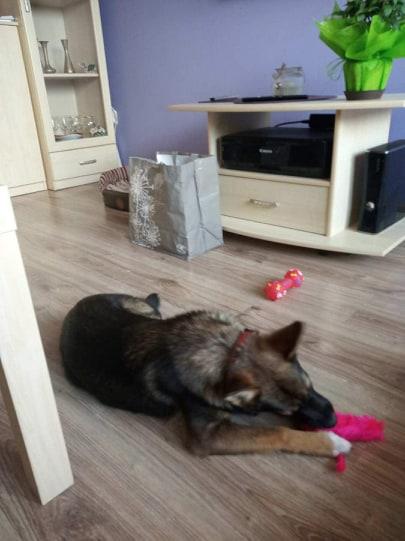 19. U Neski wszystko bardzo dobrze. Na dworze szaleje z radości, uwielbia się bawić z innymi pieskami. Uwielbia dzieci. Zaczepia obcych ludzi na dworze by ją głaskać .Była po raz pierwszy nad jeziorem i była zafascynowana łabędziami . Kocha wszystkich w rodzinie ale najbardziej upodobala sobie młodszą Pańcię. Nie chce spać w legowisku tylko pakuje się do łózka :).