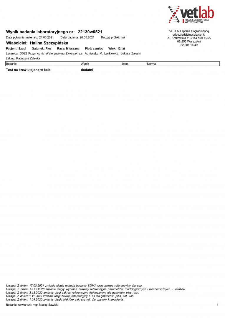 "Dzień dobry W załączniku wynik badania kału, krew utajona wynik dodatni. Bardzo proszę o przyniesienie kału z kilku dni ( w jednym pojemniku) na badanie w kierunku pasożytów, Katarzyna Zaleska." "Krew utajona w kale wynik dodatni potwierdza krwawienie do światła przewodu pokarmowego. Przyczyny krwawienia mogą być różne, dlatego konieczna jest dalsza diagnostyka w celu wykrycia powodu krwawienia"