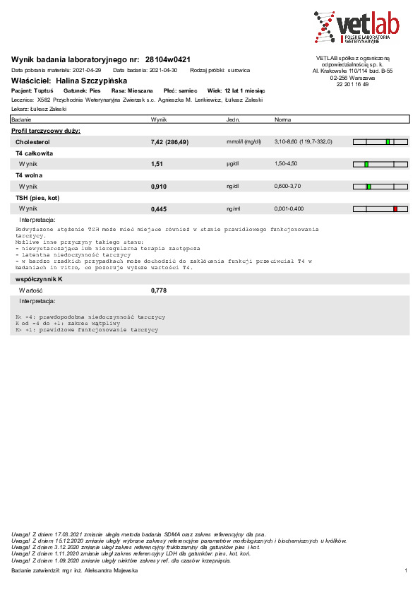 Byłam w lecznicy i rozmawiałam z wetką prowadzącą Pikusię. Wyniki dobre..., Pikusia jest na karmie weterynaryjnej której zadaniem jest zapobieganie infekcjom pęcherza i dróg moczowych i ułatwienie przepływu moczu kanalikami - dokładniejsze opróżnianie pęcherza. Nic złego się nie dzieje. Diety nie zmieniamy! Leków nie wprowadzają! Nadal pozostaje tylko na diecie weterynaryjnej. Wyniki dobre. Nie ma przeciwskazań do szczepienia przeciw wściekliźnie i przeciw zakaźnym. Przeciw zakaźnym zaszczepić dla bezpieczeństwa panienki. Zaszczepię 10 mają (przy okazji zabiegu Tuptusia) ps W listopadzie 2019 roku miała wypadek - połamany kręgosłup w odcinku lędźwiowym. Pikusi pomagam opróżnić pęcherz. .., nadal wszystko działa bez wsparcia farmakologicznego -