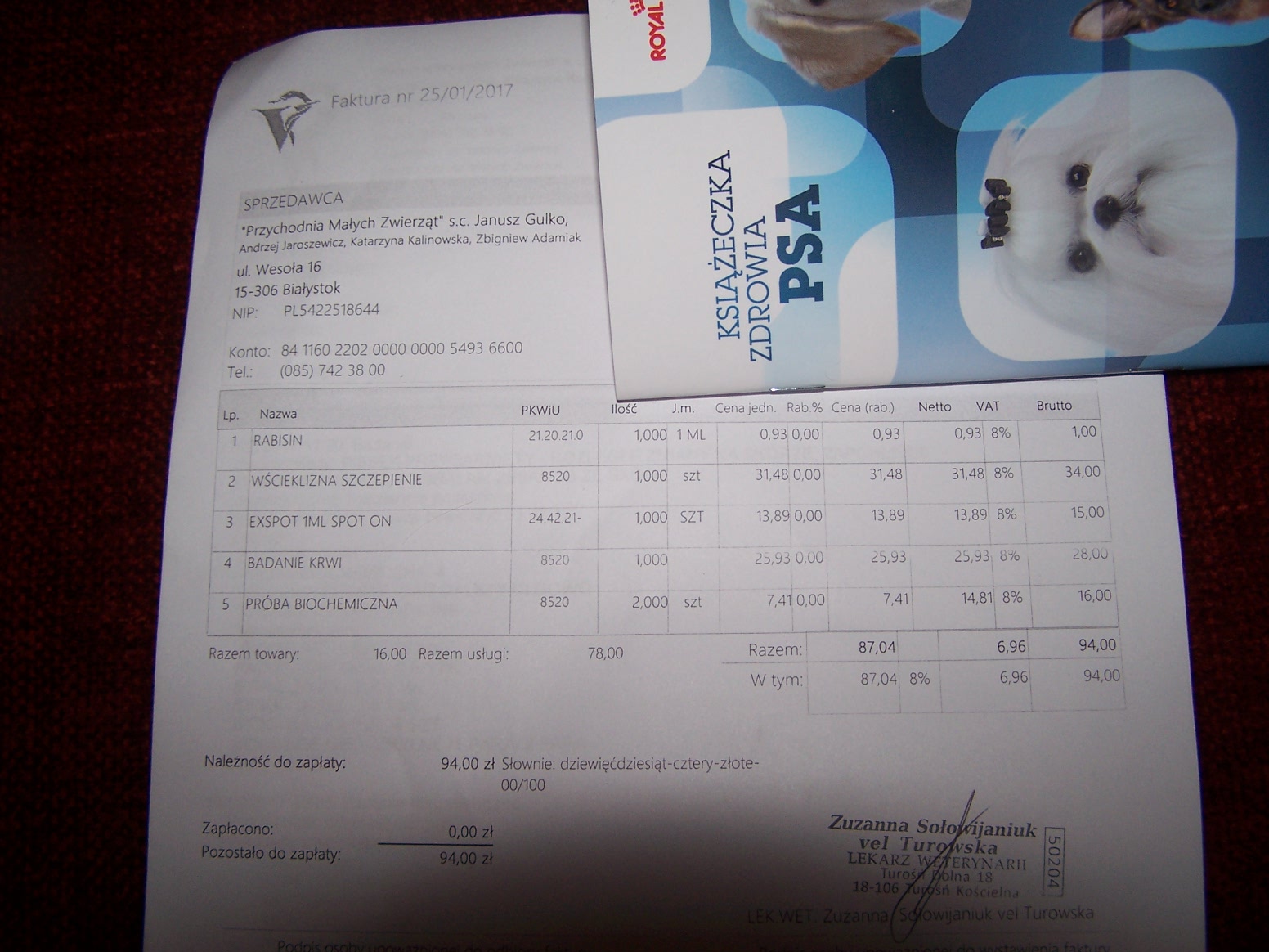 Promyczek został dziś zaszczepiony przeciw wściekliźnie. Zabezpieczony od kleszczy Waży 8,5 kg (od pierwszej wizyty 17 lutego waży o 1 kg więcej ) Pobrano krew (wynik wieczorem) Włos odrasta...utrzymujemy leczenie (kąpiele, pryskanie + leki doustne ). Pani doktor Kalinowska, zadowolona z postępu w leczeniu Odebrałam wydruki dokumentacji medycznej. Założyłam książeczkę zdrowia - została uzupełniona Zapłaciłam - przejazd 5,00 zł (koszt 1/2)