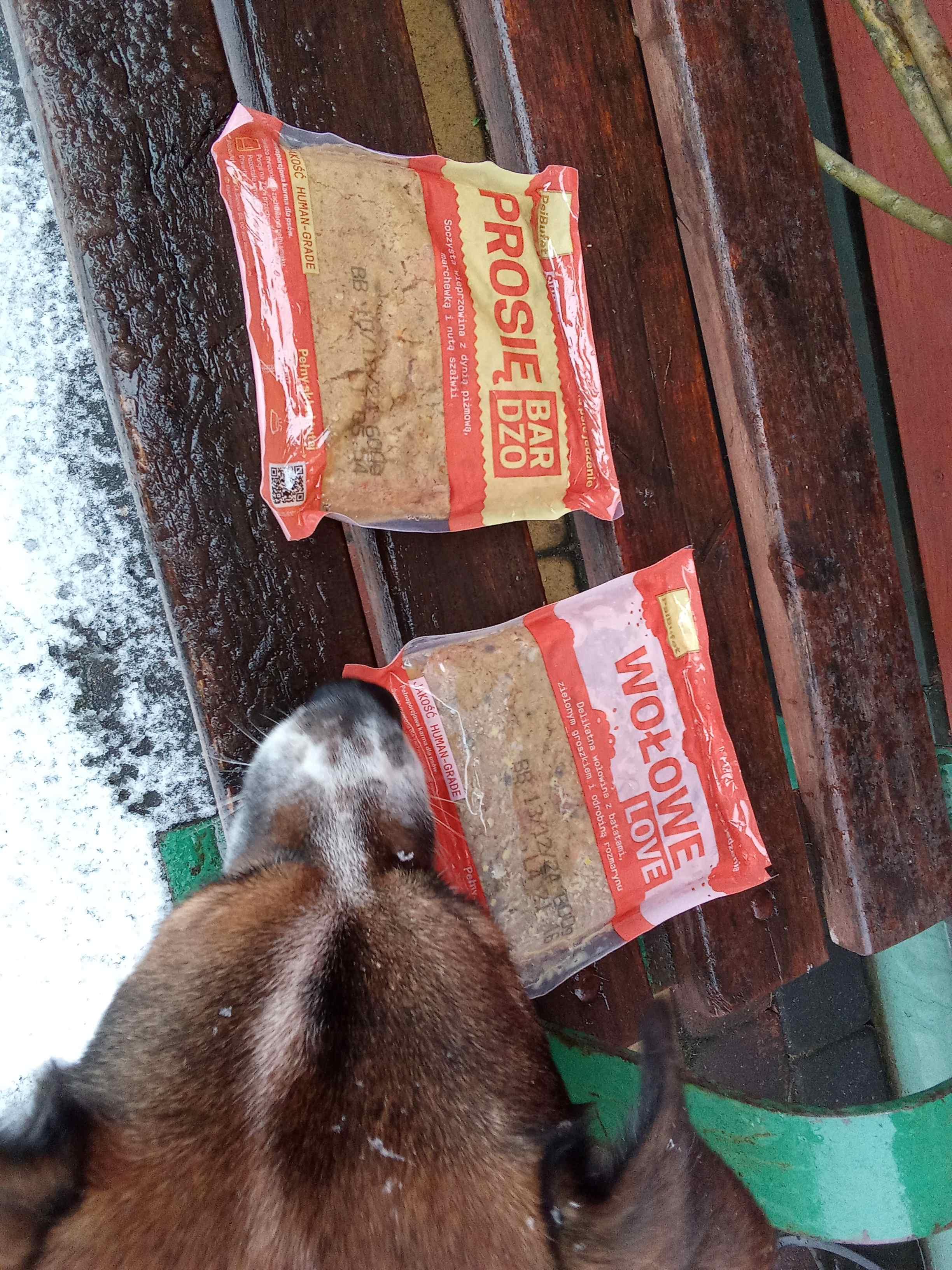 Psiaki dostały prezencik, od znajomych psiarzy z Królowego, - 2 porcje po 600g jedzonka z PsiegoBufetu - wieprzowina z dynią piżmową, marchewką i nutą szałwii - wołowina z batatami, zielonym groszkiem i odrobiną rozmarynu Sierściuchy ocenią ps - termin przydatności - grudzień 2024/ przechowywać w zamrażarce - po otwarciu można przechowywać 7 dni w lodówce