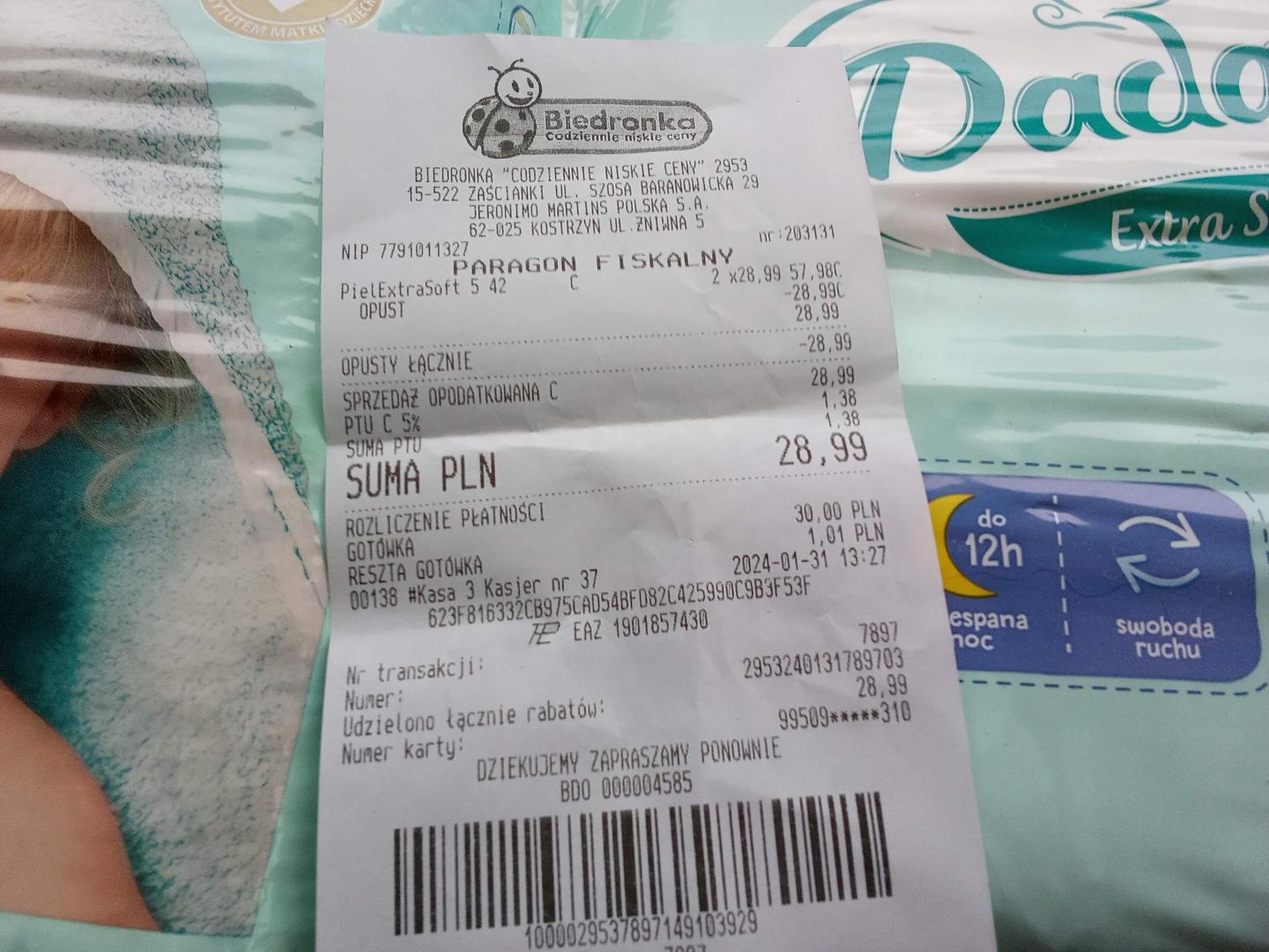 Kupiłam w promocji pieluszki 2 x 42szt = 84szt / 28,99zł / 31.01 (paragon) 42szt dla Pikuni i 42szt dla Misia -