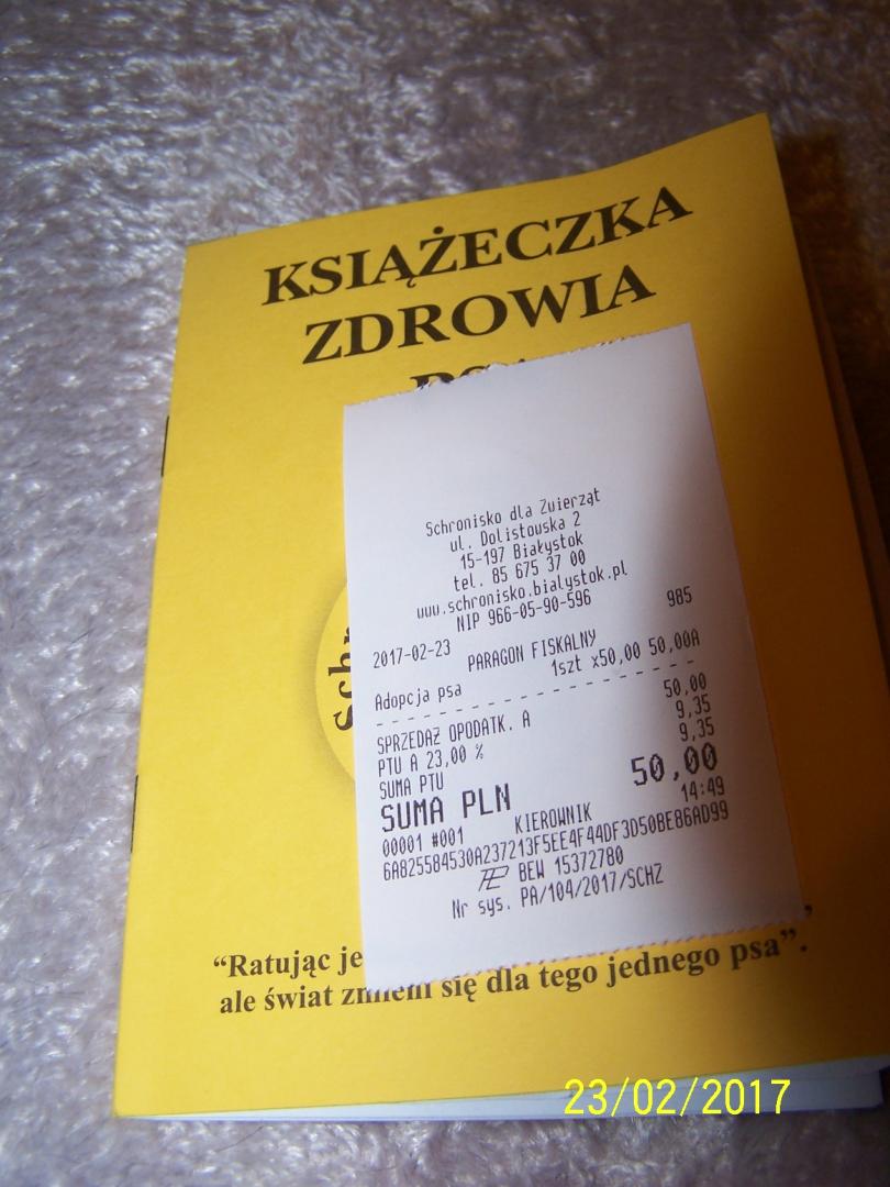 Dotychczasowe WYDATKI Ptysia. 582,59 zł / 08.03 - opłata za dt za marzec ( 270 zł + 30 zł joi / pdt ) + faktury za leczenie wet.+ opłata w schronisku: 50,00 zł - 23.02 ( opłata w schronisku ) gotówka/paragon 115,00 zł - 25.02 ( wizyta w lecznicy + morfologia ) gotówka/paragon 39,59 zł - 27.02 ( zakup leków ) gotówka/paragon 78,00 zł - 06.03 (badanie morfologia + kał ) gotówka/paragon ________________ 282,59 zł - wpłynęło na nasze konto 08.03 300,00 zł - ( koszt pobytu z wyżywieniem - marzec ) - 08.03 582,59 zł – wpłynęło 08.03 270zł / 27.04 - opłata za dt za kwiecień + 30zł joi / dt270zł / 25.05 - opłata za dt za maj + 30zł joi / dt270zł / 03.07 - opłata za dt za czerwiec + 30zł joi / dt 30 zł / 25.07 - deklaracja stała za lipiec joi / dt 30 zł / 10.08 - deklaracja stała za sierpień joi / dt 270 zł / 28.08 - opłata za dt za sierpień 270 zł / 02.10 - opłata za dt za wrzesień 270 zł - opłata za dt za październik 60 zł / 06.10 - deklaracja stała za wrzesień i październik joi / dt 50 zł / 29.08 ( Ptyś i spółka ) od E.R. (przeznaczymy na szczepienia przeciw wściekliźnie, przeciw wirusowe - rozliczenie na wątku Dianki) kontrolna wizyta w lecznicy / pobranie zeskrobu - 101 zł / 08.03 ( paragon ) opłacił PDT wizyta w lecznicy + leki - 66,65 zł / 06.04 (paragon) opłacił PDT obroża Foresto - 10.05 / przekazała dreag -