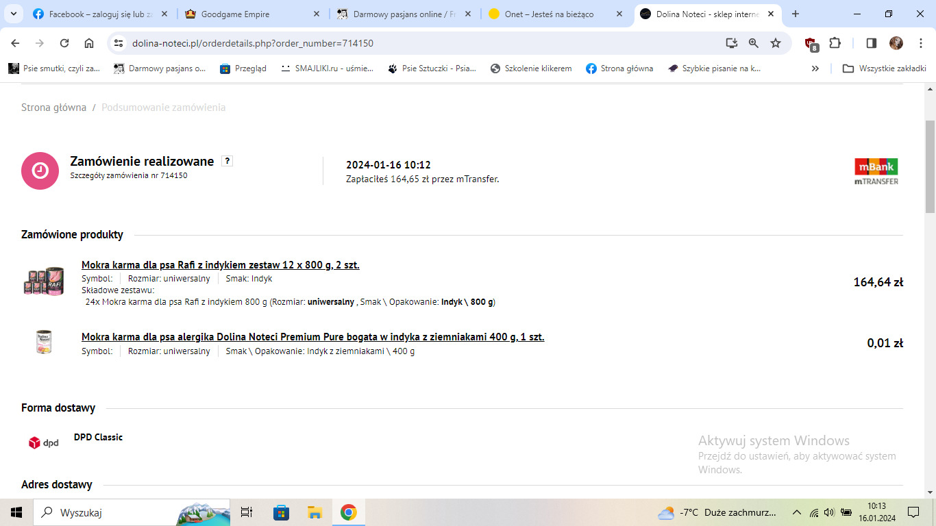 Kupiłyśmy dla stada puchy Rafi z indykiem 24 x 800g + Dolina Noteci 1 x 400g / 0,01zł . Zapłaciłyśmy 164,64zł / 16.01 (przelew)