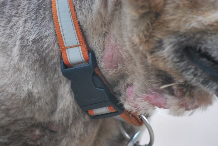 I wstawiam te zmiany skórne. W zależności od dnia mają mniej lub bardziej różowy kolor, ale normalny to miały chyba tylko pierwszego dnia po obcinaniu. Na pysku wychodzi jej też wysypka gdy to się nasila. Ma jeszcze taką obwódkę wokół prawego oka, która też się dodatkowo zaczerwienia razem ze skórą. Zdaje się to nie mieć powiązania z jedzeniem. Nie wiem co to. Przynajmniej wszystkie rany się zagoiły i skóra jest sucha. Macie jakieś pomysły? Czy nie ma już co dłużej czekać i jechać do weta? -