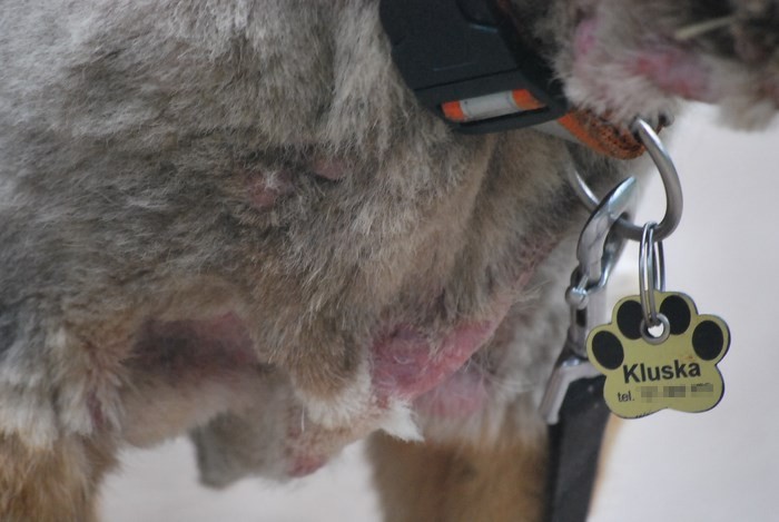 Takie błędy to nie błędy;) Wczoraj znalazł się ten czas i byłem z kluską u weta. Dostała antybiotyk (Synergal 500 mg), coś na polepszenie skóry / futra (Coatex) i szampon leczniczy - robiony na miejscu. Zapłaciłem 50 zł i za tydzień kontrola. Przez ten czas mam ją wykąpać 2-3 razy, na ile szamponu wystarczy. Wstawiam skan. Nie wiem bo miała gęste futro, ale podejrzewam, że tak. Jej skórę widziałem tylko na grzbiecie w czasie kąpania. Nie podejrzewałem, że coś takiego może mieć pod szyją. OK, zajrzę tam. Rozliczenie ze wszystkiego napiszę najdalej w niedzielę bo teraz tak na bardzo szybko tylko chciałem Was poinformować o zdrowiu Kluski, a jest trochę do rozliczania - wet, krople na pchły i Twoja wpłata. -