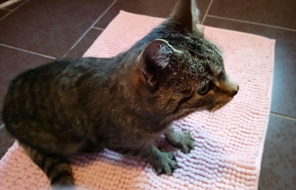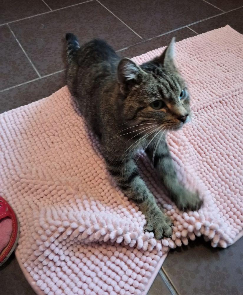 Dzisiaj nie będzie o Mimisi. Wetka wyprosiła mnie żebym na okres zimowy wzięła do siebie kota. Ja uprosiłam Połówka. Kota dzisiaj przywiozłam. Jeszcze nie jest pewne czy on dożyje do wiosny. Był przeznaczony do eutanazji, bo jako bezdomny nie miał szans przeżycia. Od pół roku miał problemy z oddychaniem, od dwóch miesięcy był intensywnie leczony przez wetkę, pro bono oczywiście, niestety z płucami jest źle, są zniszczone czy jakoś tak, nie zapamiętuję tych terminów medycznych. Kocik ciężko oddycha, nie może się męczyć bo ma ataki duszności, prawie nie je, nie pije, zaglądam cały czas czy jeszcze oddycha. Zajął dużą łazienkę z oknem. Wetka wiedziała że się Rysiowa[*] łazienka zwolniła, dlatego zwróciła się o pomoc do mnie, schronisko to dla niego śmierć, zima bez ciepłego kąta również, pod blokiem gdzie bytował też go nie chcą, przeganiają, rozwalili budkę którą zrobiła dziewczyna, ta która kota zawiozła do wetki a wcześniej dokarmiała, nawet ławkę pod którą miał kącik wynieśli. Na wiosnę ma tam wrócić, jak dożyje. Po niedzieli wetka zabierze go do miasta na prześwietlenie płuc, żeby zobaczyć co z nich zostało. Przez zimę będę próbowała znaleźć mu dom, bo u mnie na stałe zostać nie może, granice wytrzymałości Połówka zostały wyczerpane do cna przez moją niewychodzącą dziesiątkę plus psy. Choć znalezienie domu dla takiego kota graniczy z cudem to jednak z pomocą znawczyń ogłoszeniowych coś spróbuję zrobić, ogłosić na Opole, Wrocław, może zdarzy się cud, bo nie wyobrażam go sobie z tymi płucami jako kota wolnożyjącego, on nawet muchy nie złapie. Takie jest życie wsiowego kota na zadupiu. A to kot, bezimienny jeszcze Jakby mógł to by wszedł człowiekowi do środka, taki miziak, cały czas ugniata ciasto na swoim pierwszym w życiu, prywatnym, nowiuśkim, prosto z Pepco dywaniku ;)