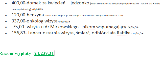 Yucca-130,00 08/11/16 (10zł), 28/08/16 (120zł) Nadziejka- 25,00 08/10/17 Elwira D.z FB- 50,00 06/11/17,04/2019 P.Małgosia z Londynu- 95,00 08/11/17 (75zł),30/01/18 (20zł) Basia K- 20,00 29/12/17 Beat2010- 50,00 29/12/17 100,00-saldo po Dewonku w DS-Mdk8 17/01/18 Mdk8- 30,00 26/04/18 (20zł), 05/06 (10zł) Dorcia2- 500,00 200,00-Skarpeta im.Tallcot 16/07/18 256,40-saldo po ukochanym Ignasiu 28/06/18 Agat21- 20,00 304/07/18 160,00-saldo po ukochanym Dieselku * Beat2010 12/02/19 100,00-saldo po ukochanej Duszce Jaguska 28/02/19 1144,00-pieniążki ze zbiórki pomocowej zorganizowanej przez Beat2010 26/03/19 Jaguska- 30,00 19/04/19 Elypsa- 240,00 od 05/2019 - 04/2020 po 20 zł zapisuję jako jednorazowe Livka- 100,00 od 05/2019 - 09/2019 po 20 zł zapisuję jako jednorazowe Milagros19835201-70,00 01/10/16 (10), od 05/2019 - 04/2020 po 5 zł zapisuję jako jednorazowe Suma: 7.652,41