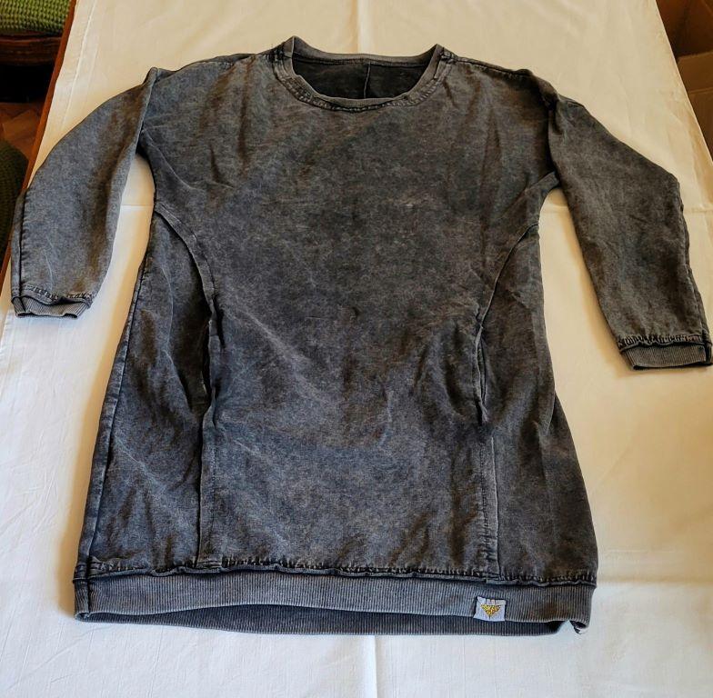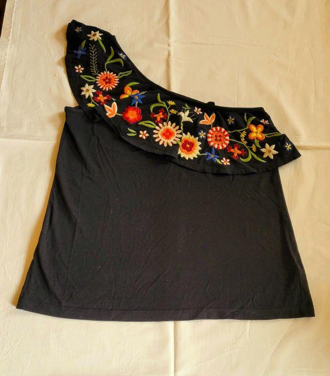 23.Czarna bluzeczka 100% bawełna Na jednym ramieniu ramiączko (niewidoczna na zdjęciu) Falbana z haftowanymi kwiatami. Pod pachami 2 x46 cm Długość od pach 42 cm CW 8 zł Aldrumka za CW 24.Sukienka 55% bawełna, 45% poliester Pod pachami 2 x 44 cm Długość 88 cm CW 10 zł U góry wzór dziurkowany 25.Sukienka/tunika Pod pachami 2 x52 cm Długość 80 cm Kieszenie CW 10 zł 26. Narzutka Styl oversize CW 15 zł