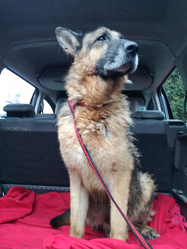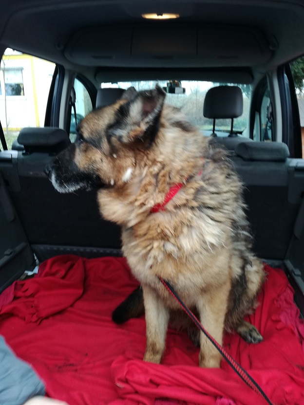 Jestem...To był dobry dzień, cudny owczarek pojechał...Na komendę Hop! wskoczył do samochodu i usiadł. Daje sobie sobie założyć obrożę, chodzi na smyczy. TZ Toli zajrzał do pysia, chcielismy zobaczyc ząbki, to mruknął...Psiak ok 5-6 letni. zna komendy siad i podaj łapę...Cudo nie pies...Popatrzcie: -