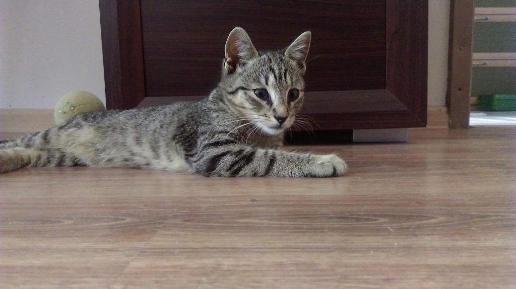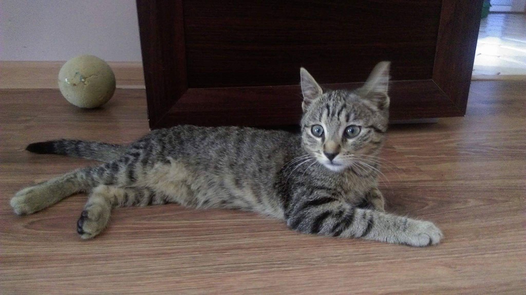 A to znaleziony wczoraj na nocnym spacerze mały kotek. Dostałam info, że koteczek bardzo grzeczny, korzysta z kuwety, bardzo chętnie się bawi. -