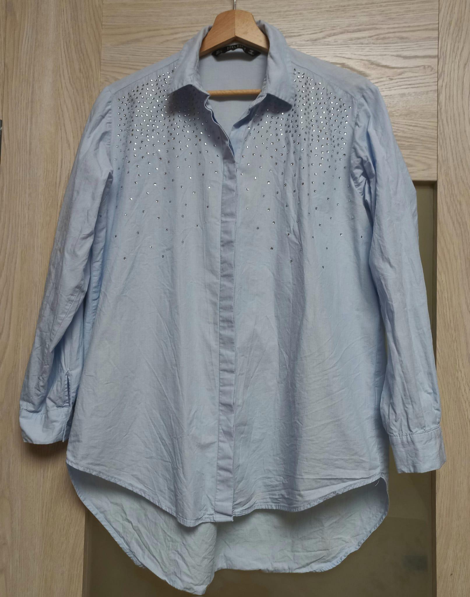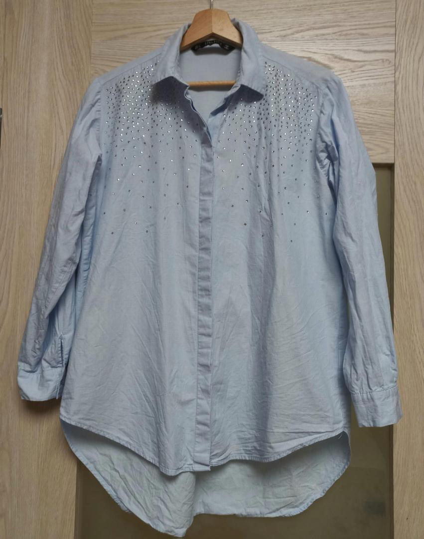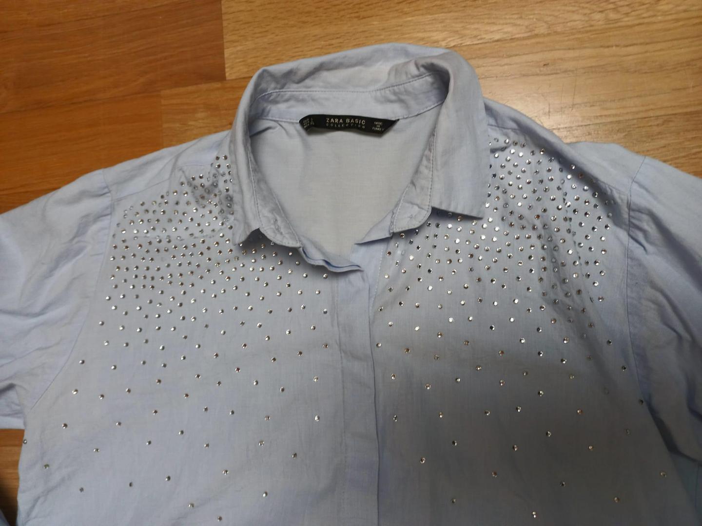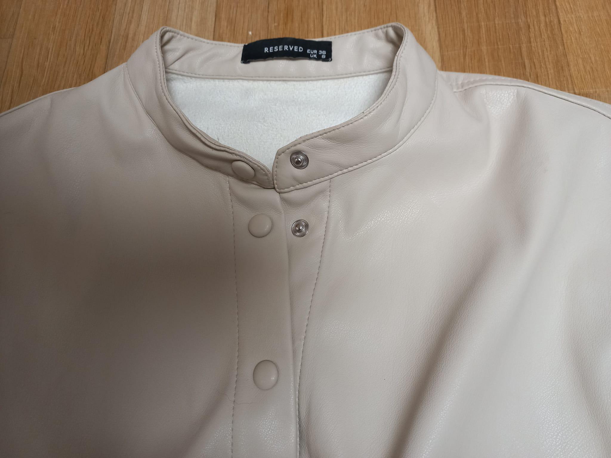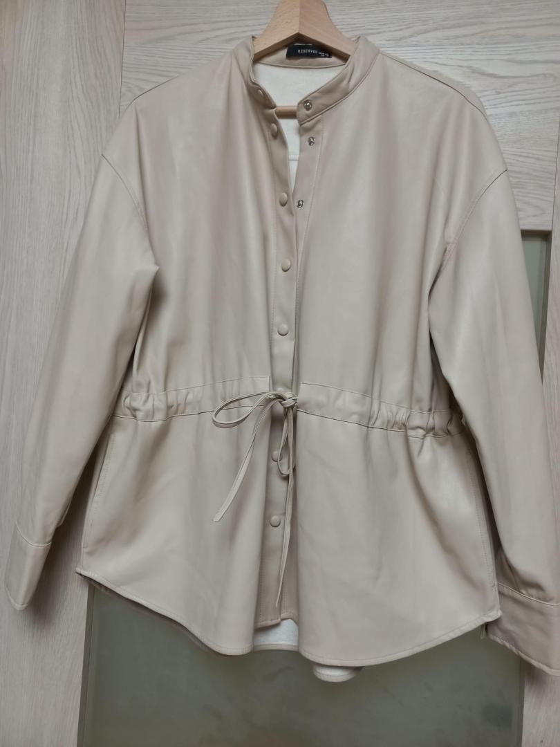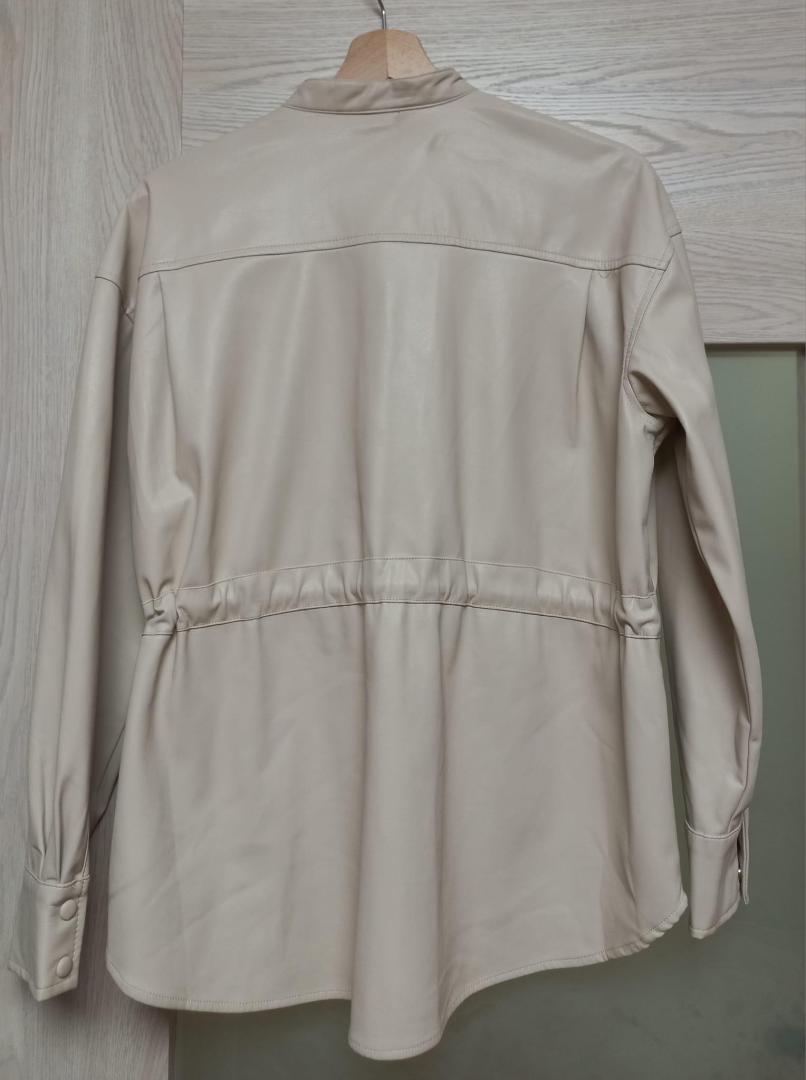 5. 45. Bluza ze skóry ekologicznej RESERVED, rozm.36, na 38 też powinna być dobra, dł.tyłu 72cm, szer.między pachami 59cm, zapinana na guziczki, w pasie tunel ze sznurkiem cw 25zł 46. Efektowna bluzka ZARA z błyszczącymi dżecikami na górze, rozm.L, dł.tyłu 79cm, przód krótszy, szer.między pachami 56cm, bawełna cw 25zł