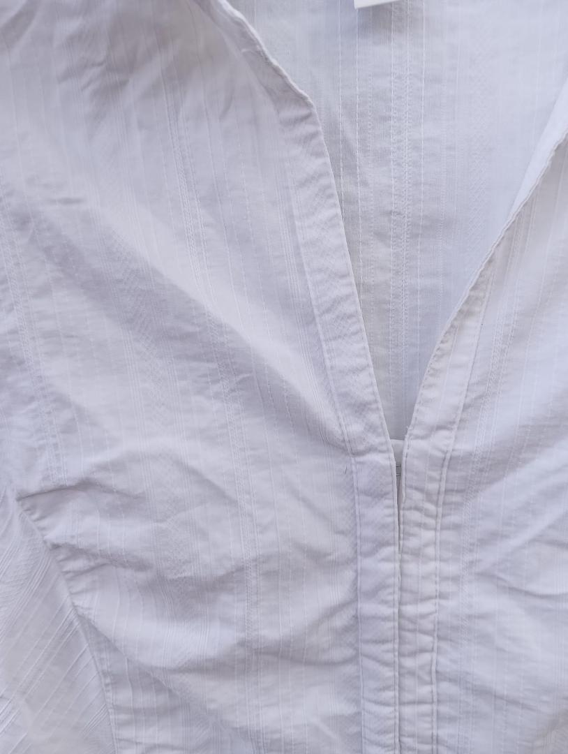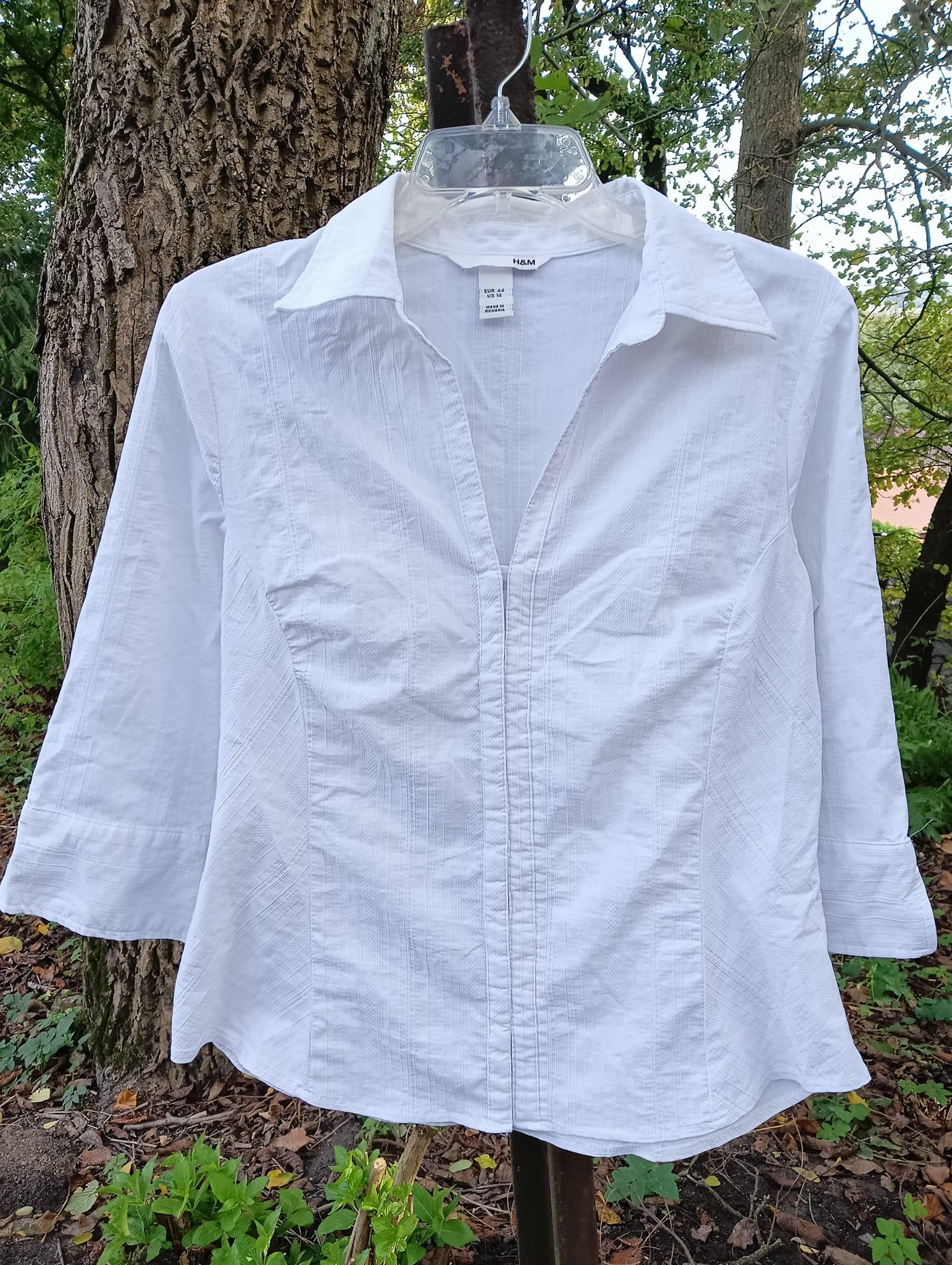 19. 7. Spódniczka CW 6 zł 8. Rozpinana tunika, rozm. S CW 10 zł 9. Szara narzutka F&F, brak metek, wygląda na ~M CW 5 zł 10. Biała bluzka koszulowa H&M zapinana na haftki, wygląda na M, 72% bawełna, 25% poliester, 3% elastan CW 7 zł
