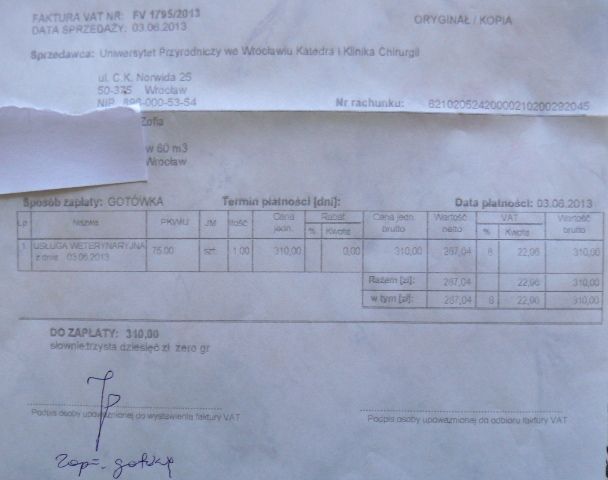 Zosia123 Posted June 6, 2013 Author Posted June 6, 2013 (edited) Jeszcze raz dziękuję Ci za opiekę nad Atosiem! Rozliczenie uzupełniłam. SALDO: [SIZE=3][SIZE=3]-[SIZE=3][SIZE=3][SIZE=3]1062,[SIZE=3]42[SIZE=3] zł :( (Na tę krew, za którą dałam 300 zł, będę miała fakturę, nie wzięłam jej od razu bo się spieszyliśmy w czwartek żeby Atos jak najszybciej miał transfuzję). Tymczasem dostałam 100 zł od Cioci Szira i 200 zł od Mikołaja - bardzo dziękuję!!! Edited June 6, 2013 by Zosia123 Quote