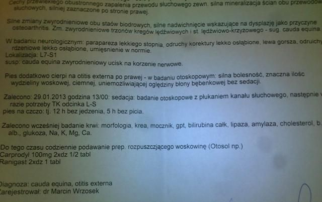 Zosia123 Posted January 15, 2013 Author Posted January 15, 2013 (edited) Rex zmienił DT, niestety nie mógł już zostać w domu pani Ani. Bardzo dziękujemy za dotychczasową opiekę i socjalizację! :) W zeszłym tygodniu p. Ania była u neurologa, mamy zalecone tabletki i oczywiście dalsze konsultacje. Dzisiaj pobraliśmy krew, wyniki będą wieczorem. Zgodnie z wynikami podejmiemy dalsze działania. Wklejam informacje od neurologa oraz ostatnie rachunki. (To jest 150 zł za konsultację neurologiczną oraz tablety - Carprodyl. Już zapłacone.) (To jest za badanie krwi, którego wyniki będą wieczorem. Zapłacone.) Edited January 15, 2013 by Zosia123 Quote