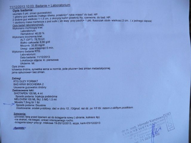 Zosia123 Posted December 11, 2013 Author Posted December 11, 2013 Reksiunio już w domku. Pan doktor usunął mu w sumie 5 guzków - 3 na szyi i 2 (jakieś niegroźne) na klatce piersiowej. Wszystkie miał już w styczniu, jak go wzięłam, ale ten jeden tylko rósł. 3 guzki mam dać do analizy, stoją na razie w słoiczku w formalince. Najważniejsze, że RTG nie wykazało żadnych przerzutów!!! :) Reksio czuje się chyba dobrze, tylko nie da rady mu założyć ani obróżki, ani szelek, więc na spacerach będzie problem, zwłaszcza że on przecież głuchy jest. Będziemy chodzić chyba przez piwnicę na tyły domu, a dzikusy (tzn. Bruno i Tola) oczywiście oddzielnie. Quote