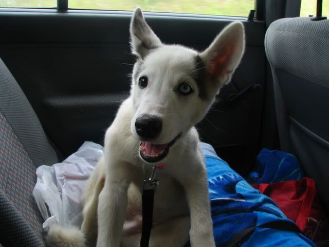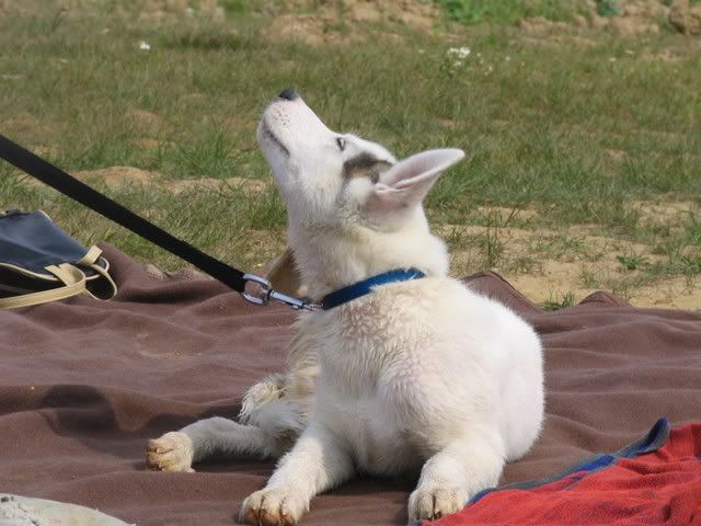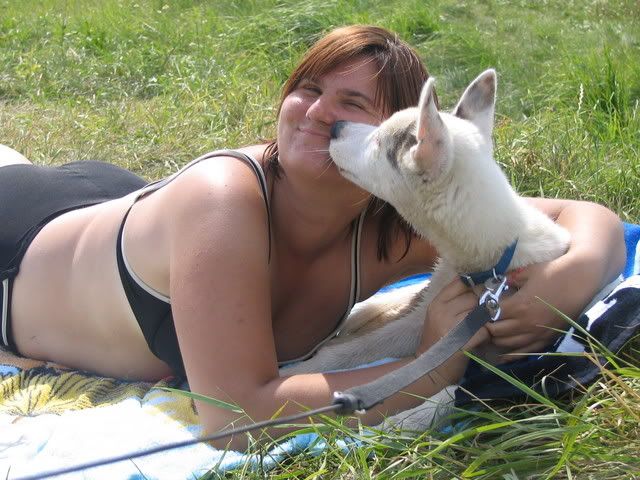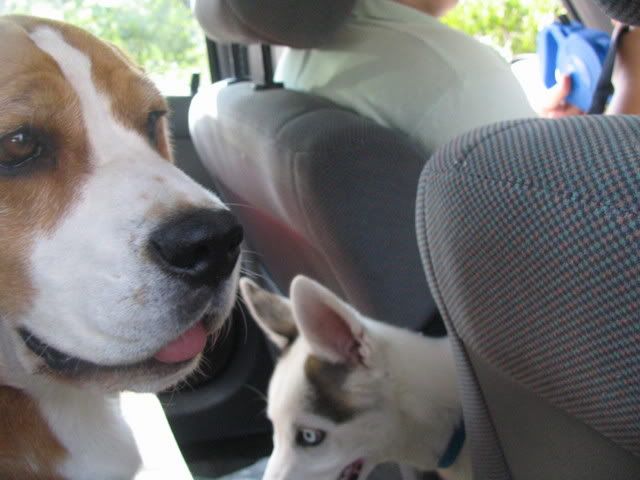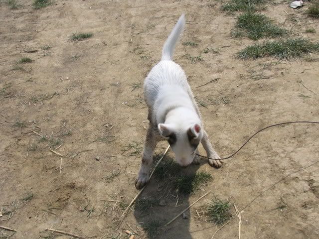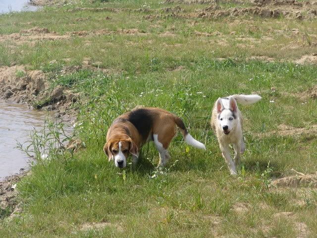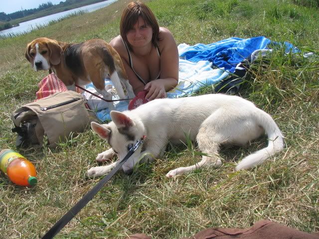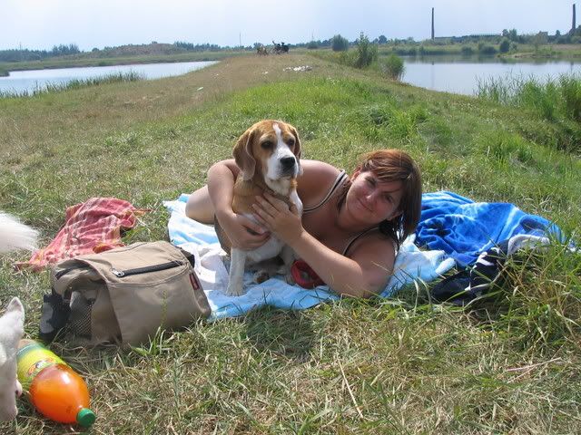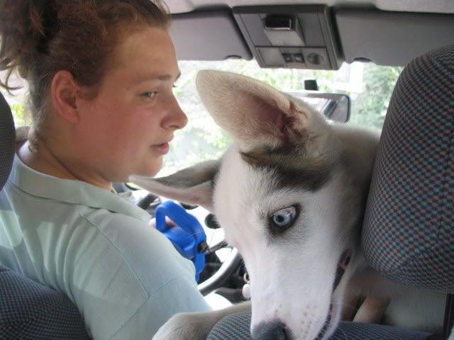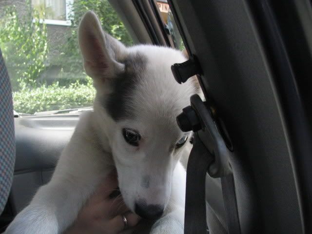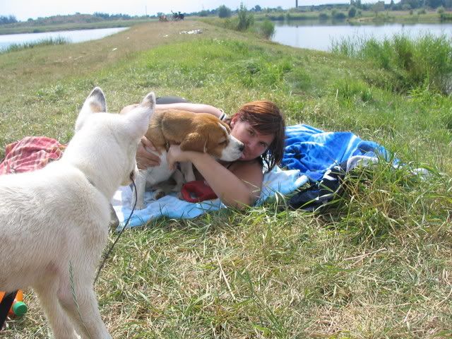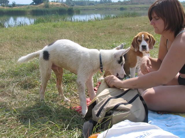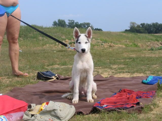 Ajka jest bardzo ciekawa świata i uwilebia podróżować samochodem :multi: Ja sama się dziwię jak ona z nim wytrzymuje kłapie tymi żebami na niego tak aby go odstraszyć ale niu ugryźc a on to ma w nosie. Biegnie biegnie wpada w nią, łapą ją zaczepia , tyłkiem ją szturcha mały zbój i ostatnio nauczył sie szczekac i teraz biega koło niej i szczeka :evil_lol: tego nauczyła go Ajka. Nauszyła go również jeśc różne śmieci z ziemi. Same negatywne rzeczy go uczy :mad: