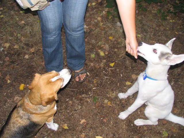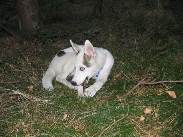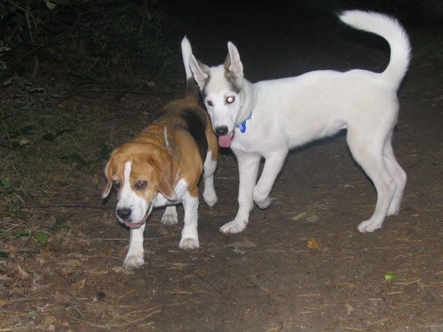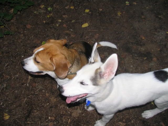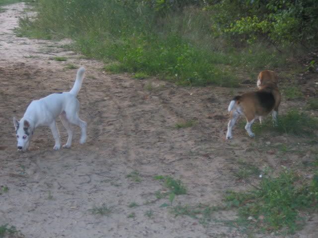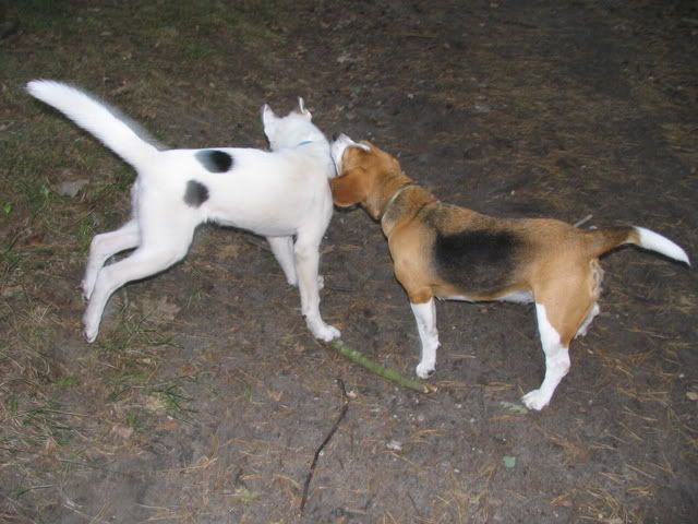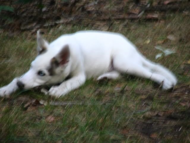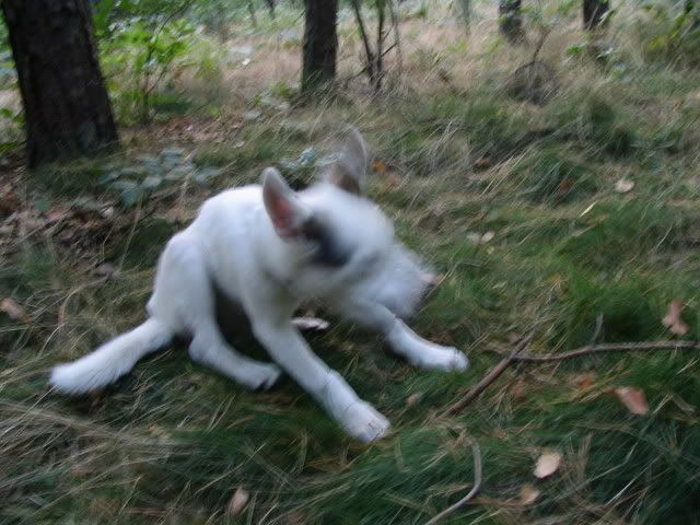 Na przywitanie Ajka merdała ogonkiem i stała z 5 min nie ruszając się a młody wchodził na grzbiet z jednej strony a schodził z drugiej, poten na głowę jej wchodzi, przeskakiwał przez Ajke a ona grzecznie stała co mnie zdziwiło:crazyeye: Zaplątały się w smycze. Po odplątaniu Ajka już nie była cierpliwa już go odganiała :evil_lol: Jak szłyśmy do lasy to jeden na lewą stronę szedłdrugi na prawą i się zmycze zaplątały. To sobie biegały szczypały popychały :evil_lol: