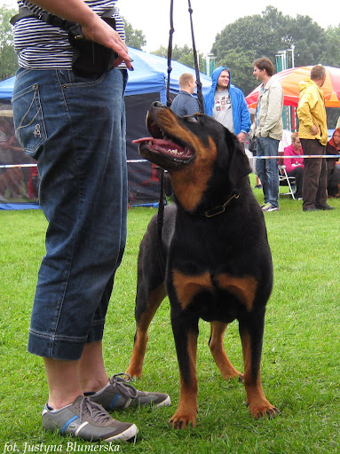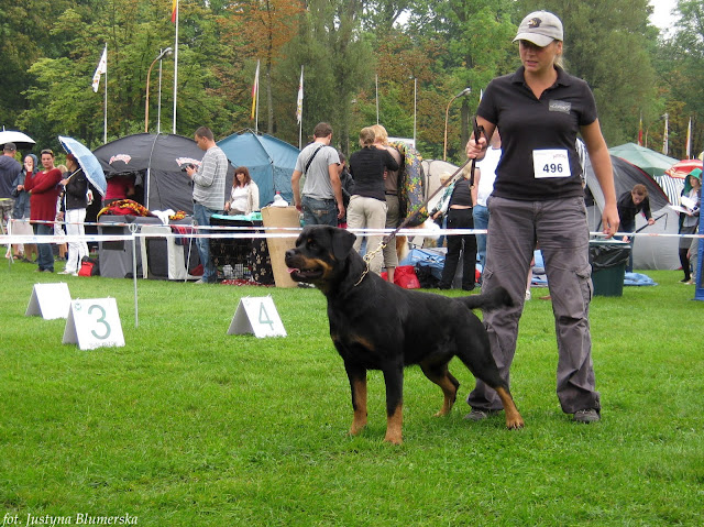 revii Posted September 2, 2012 Posted September 2, 2012 (edited) Nie spodziewałam się, że w tym roku też będę na białostockiej międzynarodówce, miałam w planach zupełnie inną wystawę, ale ostatecznie cieszę się, że wyszło, jak wyszło. Rottweilery oceniane były w niedzielę i warto zaznaczyć, że sędziowanie zaczęło się wyjątkowo punktualnie. Ring wpasowano pomiędzy dwa inne, także dostęp do niego był dość ograniczony, a przy tym nie największy jeśli chodzi o możliwość dobrego pokazania dużego psa w biegu. Plusem tego było to, że nawet mój aparat bez problemu mógł obfotografować drugi koniec ringu ;) Skoro już mowa o fotografowaniu, to zdjęcia powychodziły bardzo dobre, ale przez padający nieustannie (raz słabiej, raz mocniej) deszcz, musiałam co jakiś czas wycierać obiektyw. Z tego też powodu liczba filmików jest dość mocno ograniczona, za co przepraszam tych, którzy nastawiali się na filmową relację. Ring: 8 Sędzia: Jan Gajewski (PL) PSY kl.młodzieży SEBASTIANO Royal Avenu - I o. doskonała, Zw. Mł., NJwR ZARO von der Crossener Ranch - II o. doskonała kl.pośrednia BLACK JACK Veckarott - I o. doskonała, CWC, res. CACIB kl.otwarta Bleper's MIG - I o. doskonała, CWC, Zwycięzca, CACIB, Zw. Rasy, BOG, BIS III PARYS Cordis - nb SUKI kl.baby KIARA Rottweiler Toruń (FCI) - I o. wybitnie obiecująca, NBabywR kl.szczeniąt DELA vom Hause Edelstein - I o. wybitnie obiecująca, NSzwR kl.młodzieży NAOMI Catani - I o. doskonała, Zw. Mł. NEFRE Catani - II o. doskonała NOVA Angaros - III o. doskonała kl.pośrednia ESKA ze Żbikowa - nb TOSI Lewirot FCI - I o. doskonała, CWC kl.otwarta AKIRA Grajnfenberg - IV o. doskonała GALA ze Żbikowa - II o. doskonała PANDA Cordis - I o. doskonała, CWC, res. CACIB TARA Saturian - III o. doskonała TOLLA Saturian - nb kl.użytkowa ELLA Rottweiler Toruń - I o. doskonała kl.championów GAMA is Rojaus Sienio - I o. doskonała, CWC, Zwycięzca, CACIB Rzut oka na białostockie pucharki :) Jeśli ktoś zauważy jakieś błędy - proszę dać znać - poprawię. Edited September 3, 2012 by revii Quote