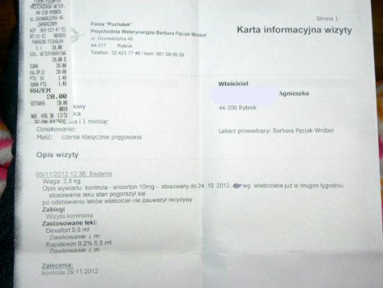 Agucha Posted September 24, 2012 Author Posted September 24, 2012 (edited) No, doczłapałyśmy jakoś do weta... :roll: Dostała: Rapidexon 0,2% -0,2ml Shotapen 100ml inj.0,3ml Nie wiem co to za leki i czy dobre (?) Wizyta kosztowała nas 45zł, powtórka we środę. Wetka stwierdziła, że jeżeli nie będzie poprawy - trzeba jej będzie usunąć zęby... myślałam, że usunąć osad a nie zęby :crazyeye: Wklejam zdjęcia wpisu w książeczce i kartę informacyjną wizyty: Edited September 24, 2012 by Agucha Quote