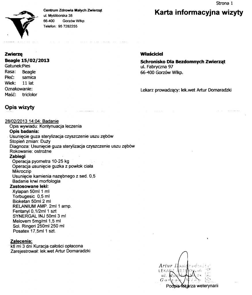Kajusza Posted February 28, 2013 Author Posted February 28, 2013 [FONT=arial][quote name='koelka']Oby tylko ten pierwszy scenariusz się sprawdził - trzymajmy kciuki za małą, ona chce jeszcze godnie pożyć :( Ela sprawdził się :loveu: [/FONT][h=5][FONT=arial]Operacja się udała :-) Rubi już nie ma żadnych guzków (poza tym dużym miała jeszcze mniejsze guzki, które też sa usunięte), została wysterylizowana od razu. Uszy też zostały wyczyszczone, ma stan zapalny na który dostała lekarstwa. Koszt tego wszystkiego wyniósł 880zł, z czego 400zł pokrywają "Beagle w potrzebie" i oni są od teraz prawnym opiekunem Rubi (wielkie dzięki Mariusz :-) ) . Pozostałe 480zł zostaną pokryte z pieniędzy zebranych na dogomanii - serdecznie dziękuję butterfy i koelce za bazarki. Operujący Rubi dr Domaradzki z Kliniki na ul. Myśliborskiej za darmo zachipował małą oraz doprowadził do porządku jej zęby :-) Za co też gorąco dziekuję :-) Dzięki temu Rubi może szukać nowego domu :-) I na koniec news - po kąpieli i goleniu do zabiegu okazało się, że Rubi ma tatuaż! Jak uda się go odczytać, będziemy szukać jej hodowcy. Serdecznie dziękuję wszystkim którzy wspomogli powrót do zdrowia Rubi, bez was nie miała by szansy na drugie życie! Dziś jeszcze zostaje w klinice a od jutra jedzie do domowego hotelu (zarejestrowany hotel a nie żadny płatny tymczas), którego koszt to 300zł miesięcznie plus karma - jeżeli ktoś chciałby wspomóc utrzymanie Rubi to proszę o wpłaty lub zakup karmy. W tym celu prosze kontaktować się z formalnym opiekunem czyli Mariuszem z "Beagli w potrzebie".[/FONT][/h] Quote