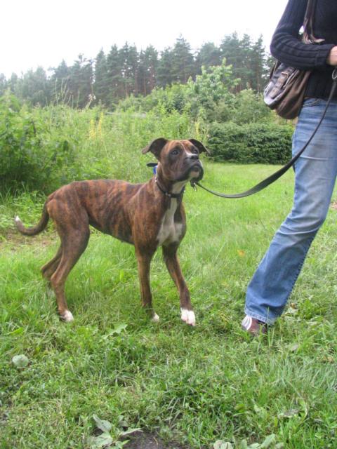 Evra Posted July 7, 2007 Posted July 7, 2007 Zdjęcia wysłane. Gaja powoli zaczyna zachowywać się jak prawdziwy bokser, nabiera sił, na spacerach szaleństwo, chciałaby pobiegać luzem, ale boję się ją puścić, ponieważ biegiem leci do każdego człowieka na horyzoncie, myśląc że to jej Pan, a nie każdy ma ochotę na niespodziewane spotkanie z rozpędzonym bokserem, szczególnie osoby z dziećmi. Dziś pierwszy raz usłyszałam jak szczeka! Próbowała szczeknięciem wypędzić z dziury w ziemi bardzo groźnego potwora tj. kupkę suchych liści :evil_lol:, a później zaatakowała mojego buta wraz z nogawką, prawie mnie przewracając :lol:. Po spacerku od razu kładzie się na kanapę i zasypia. Oczywiście śpi już tylko i wyłącznie na kanapie. Za kilka dni uporamy się z pracą , będziemy mieć więcej czasu i Gajeczka pobiega sobie bez smyczy, rozpocznie naukę przychodzenia na zawołanie. Spróbujemy też aportowania, bo powoli zaczyna interesować się patyczkami. A potem pojedziemy nad morze, a Gaja z nami. Quote