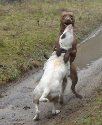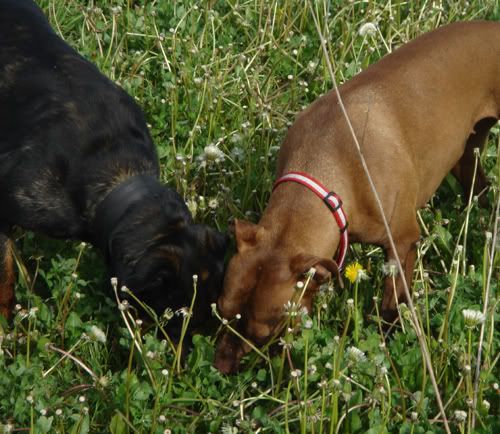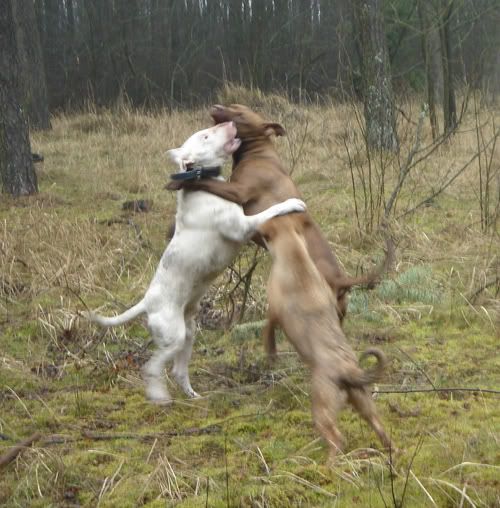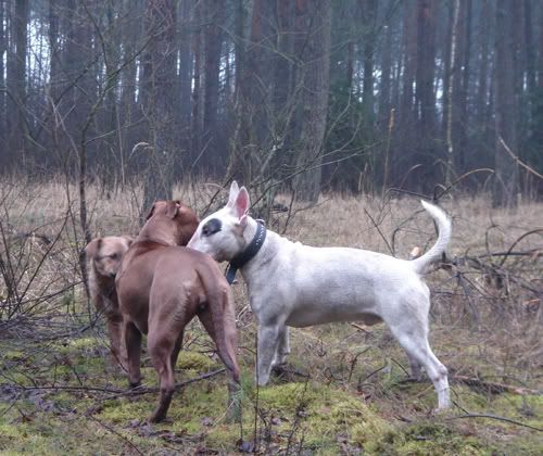 Greven Posted September 6, 2007 Posted September 6, 2007 Mayla (rottweiler) nowa w stadzie, znalazła coś ciekawego do wąchania. Natychmiast obok niej znajdowała się Tanga (pitbull) i koniecznie musiała powąchać to samo, a jednocześnie trochę przepchnąć, przesunąć Maylę. Tanga (pitbull) rezydentka i Gizmo (bullterier) tutaj znają się od kilku dni, na wspólnych spacerach wciąż jest dużo napięcia... ... i mierzenia sił Quote