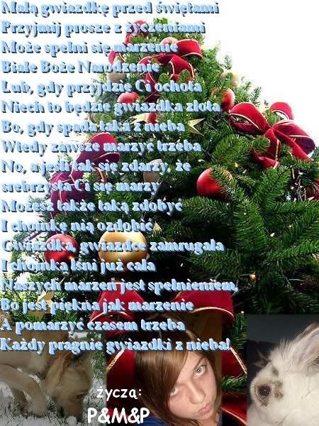 aleb Posted December 24, 2008 Posted December 24, 2008 Karpicka, barscycka, kapecke wódecki, co by smakowały wsysckie potrawecki. Mrozicku, śniezycku, miłości po zmrocku, samego dobrego w Świeta i w Nowym Rocku! :) Quote