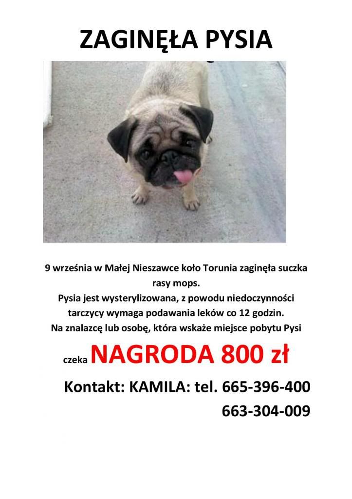 Fundacja Medor Posted August 5, 2012 Author Posted August 5, 2012 [TABLE="width: 530, align: center"] [TR] [TD="width: 530, colspan: 2"][TABLE="width: 530, align: center"] [TR] [TD][/TD] [TD][/TD] [TD][/TD] [TD][/TD] [TD][/TD] [/TR] [/TABLE] [/HR] [/TD] [/TR] [TR] [TD="width: 290"]numer: 463 numer chip: 967000009467502 imię: Mopsia płeć: suka [/TD] [TD="width: 290"]wiek: ok. 12 lat wielkość: mala rasa: mops data przyjęcia: 2012-08-01 kwarantanna do 2012-08-15 przebywa w boksie: biuro [/TD] [/TR] [TR] [TD="colspan: 2"]opis: Mopsia to starsza, łagodna sunia mops. Czy ktoś jej szuka? SCHRONISKO MARMUROWA 4 W ŁODZI TEL 42 656-78-42[/TD] [/TR] [/TABLE] Quote