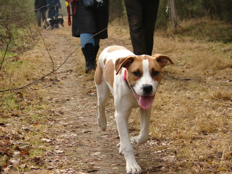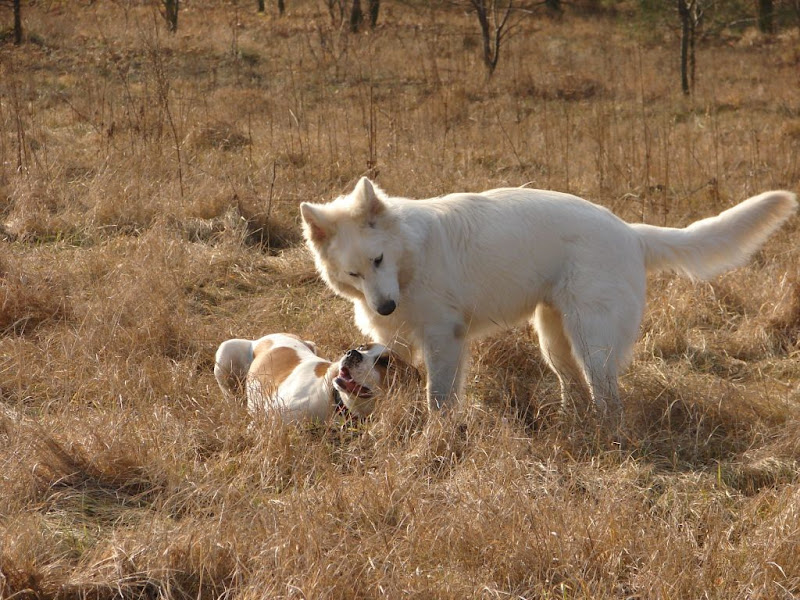 Zębowa Wróżka Posted July 26, 2008 Author Posted July 26, 2008 Gdy toledo miał pół roku powędrowaliśmy z tym dzieciuchem na szkolenie. Coś nam mówiło, że bydlątko ma potencjał, bo jakoś szybko chwytało różne rzeczy. Nie chwytało jedynie, że zasikiwanie nam schodów powoduje u nas 'taniec z mopami' i mordercze spojrzenia w stronę łaciatego siuśka. Tak, czy inaczej zaczęła sięregularna edukacja i pierwsze, przedwiosenne spacery szkoleniowe: Toledek zaczął poznawać nowych kolegów. Obecnie niestety te owczarek szwajcarski bardzo go tarmosi :/ Już na tym zdjęciu zresztą szwajcar wygląda trochę jak wilczek z 'Draculi' :BBB Quote