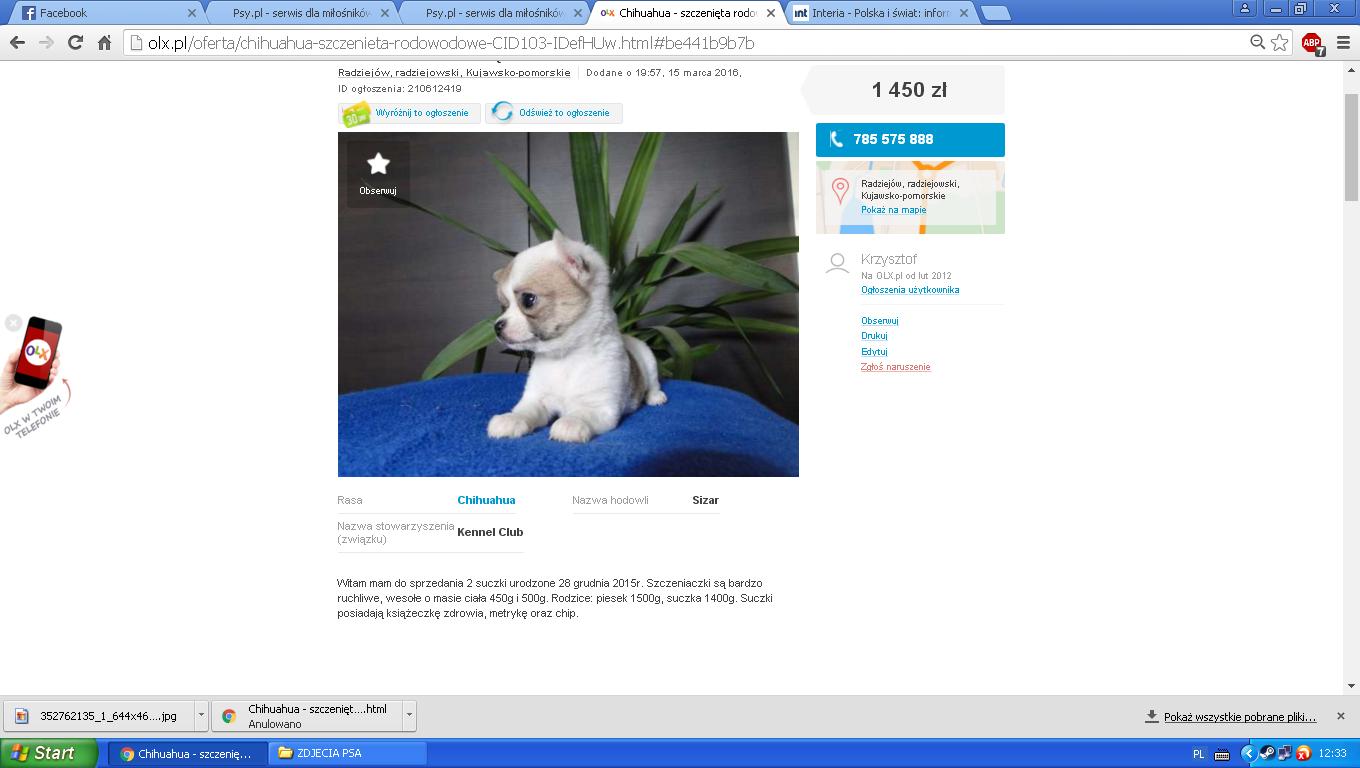 Muras Posted March 21, 2016 Posted March 21, 2016 Witam.Wczoraj mój ojciec pochopnie kupił psa .Chciałbym zapytać czy ten czworonóg wg was to 100 procentowy pies tej rasy i czy cena tego psa była dobra (zapłaciliśmy 1300 złoty)?Boli mnie to że w opisie na olx było napisane że pies ma metrykę, a ojciec dostał tylko książeczkę zdrowia i chip.Tata podpisał umowę i czy ma prawo zabiegać o metrykę albo czy prosić żeby ją wysłał ? Chciałbym jeszcze zapytać czy te 1300 złoty za takiego psa bez rodowodu i metryki jest dobra? Jeśli tak to po sparawdzeniu psa u weterynarza byśmy go sobie zostawili.Od umowy podpisanej poza hodowlą(firmą) można chyba odstąpić w okresie 2 tygodnii więc jakoś byśmy typa załatwili. Oczywiście jeśli wszystko było by ok pies zostaje(w sensie cena bez rodowodu niezła i zdrowy). Bardzo prosiłbym was o rady.Naprawdę zależy mi na odpowiedziach i waszej szybkiej pomocy.Zdjęcia m.in. z aukcji i samego psa w załącznikach. Quote