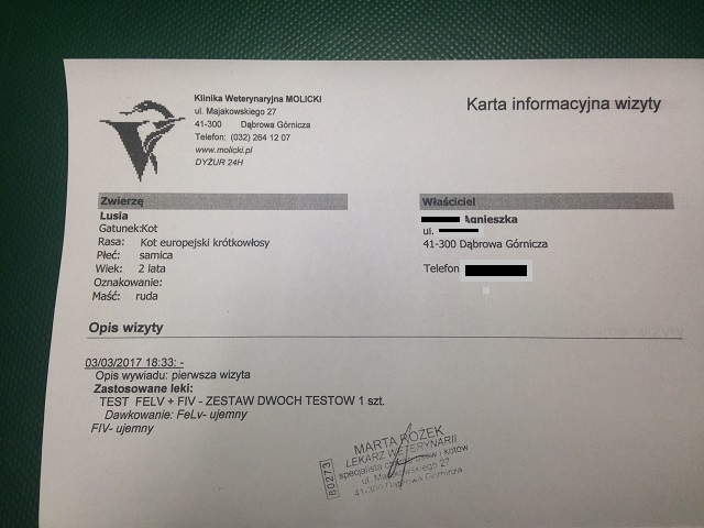 Gabi79 Posted March 4, 2017 Posted March 4, 2017 Lusia... koteczka porzucona w moim bloku na klatce schodowej. Historia zaczęła się ponad 2 tygodnie temu. Czekałam rano na windę z moją Kajunią i nagle usłyszałam glośne miauczenie kota kilka pięter niżej. Nie miałam czasu na poszukiwania. Wieczorem pojawiły się na parterze 2 ogłoszenia, iż znaleziono kota, który teraz znajduje się w mieszkaniu nr ... Właściciel proszony o odebranie zguby. Ogłoszenia szybko zniknęły, byłam więc pewna, że kotek wrócił do domu. Przedwczoraj zagadnęła mnie pani z parteru od pudelka. Kilka osób z bloku przeprowadziło małe śledztwo i okazało się, że właścicielka kota się wyprowadziła, a on został na klatce schodowej. Przez ponad 2 tygodnie chodził po piętrach w okolicy windy towarowej. Wykonałam szybki tel do AgusiP, Agusia do Joanki40 i Joasia zgodziła się przyjąć kotka na BDT. Ale w czwartek po moim powrocie z pracy, ani wieczorem nie udało mi się biedaka namierzyć. Wczoraj rano pytałam ochroniarza i dozorczyni, też kotka nie widzieli. Przeraziłam się, że może kotek zaczął komuś przeszkadzać i ktoś mu zrobił krzywdę. W bloku, gdzie jest 230 mieszkań o idiotę nietrudno. Po południu zadzwoniła do mnie p. Danusia, która ma Misię z Dogo z informacją, że kotek jest na schodach do piwnicy. Jedna z pań przejętych losem kotka (a właściwie kotki, bo okazało się, że to dziewczynka), na moją prośbę wzięła ją do siebie do czasu aż przyjadą AgusiaP i Mysza2. Dziewczyny, jak zawsze niezawodne i gotowe do pomocy zjawiły się ekspresowo. Potem była wizyta u weta. Testy na FELV i FIV ujemne. Koteczka dostała imię Lusia. Ma przepuklinę wielkości dużej mandarynki, została oceniona na 2 lata. Za testy dziewczyny zaplacily 150,- Lusię czeka jeszcze sterylizacja i operacja przepukliny. W tym momencie Lusia jest na minusie. Jak zwykle z całego serca proszę o wsparcie. Za każdą formę pomocy będę ogromnie wdzięczna. Quote