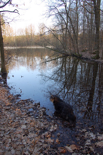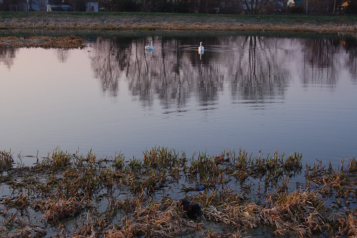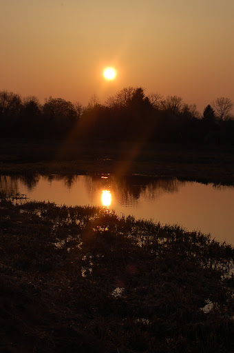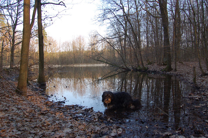 E-S Posted April 3, 2010 Posted April 3, 2010 Było pięknie, byliśmy aż do zachodu wiosennego słońca to ten zachód, o którym wspominałam: Jednak zbyt długie towarzystwo Bugiego i kilkugodzinna obserwacja jego polowań na kaczki podziałała na Zdrapkę demoralizująco, gdyż matole jedno postanowiło kumplowi pokazać jaka jest odważna i rzuciła się w wodę polować na ... większe od niej łabędzie, to ta czarna plama na środku zdjęcia na dole to płynąca po zdobycz w postaci łabędzia - Zdrapka tu już zawraca z żalem bo wrzeszczeliśmy na nią oboje: a może jednak ???? Jak wali mułem i rybami ... niby w sumie wielkanocnie, rybne święta, ale nie zdzierżę, idę kąpać kudłatego śmierdziucha, będzie ofiarą wielkosobotnią. Quote