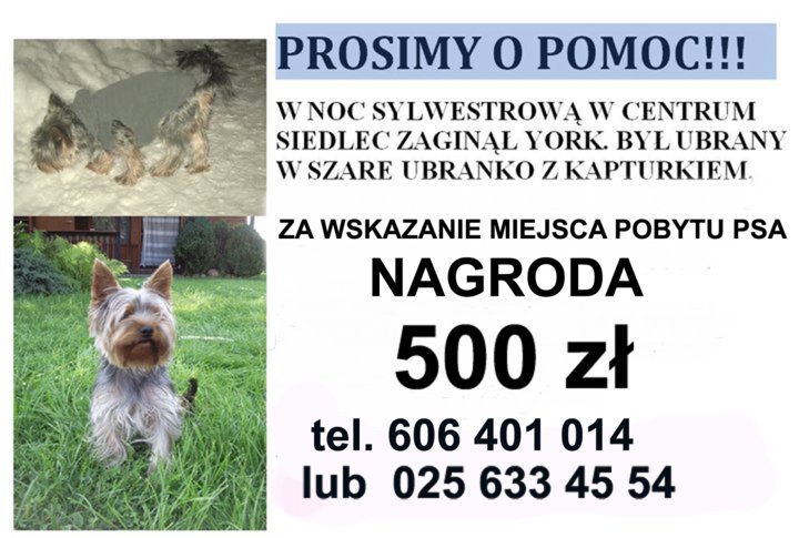 trusia23 Posted January 5, 2011 Posted January 5, 2011 znalazlam ogloszenie na ale.gratka.pl W nocy z 1 na 2.01.2011 zaginęła suczka YORK o imieniu KIKI. Suczka widziana była na skrzyżowaniu ulic Kolumny i Tomaszowska (os. Wiskitno). Uczciwego znalazcę proszę o kontakt pod nr tel 608 195 450 (Na fotografii suczka z lewej strony). NAGRODA! Quote