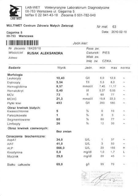 Lulka Posted March 7, 2010 Author Posted March 7, 2010 [quote name='L/Olka']zagoniona jestem strasznie, więc się nie odzywam, przepraszam :) Sprawa wygląda tak: te wyniki krwi wskazują na jakieś stany zapalne wątroby. Dostała essentiale forte plus coś jeszcze, łyka. Kał miał być wczoraj zawieniony do kliniki, od razu na Gagarina, bo u nas je zbywali. No i na razie więcej nie wiem. Poczekajmy na wyniki, a potem zarządzimy, co dalej. Za badania plus leki rozliczę się z nimi z tych 100 zł, o których ostatnio pisałam - że Misia je dostała. Jak poznam ceny, to dam znać. bosze nastepny "genialny" wet!!!!!!!!! ona ma super wyniki watroby! Taki sam madry leczyl moja suke. Wyniki watroby ok (Aspat, AiaT) tylko AP podwyzszone, to najprosciej powiedziec ze watroba chora. Wiec przez pol roku niepotrzebnie dawalm psu najpierw essentiale potem hepatil (jest o wiele tanszy) i co??? po półrocznej kuracji? a tak zwane jajco, wyniki bez zmian.....bo to z watrobą nie ma nic wspolnego - jesli pozostale 2 czynniki są ok i na USG nic nie widać - tak jak u Misi. Porazka z tymi wetami. Czy ten kał dojechal juz na badanie? (swieży;-)) prosze badania ponad 10 letniej suni - zobaczcie na wyniki wątroby!!! Quote